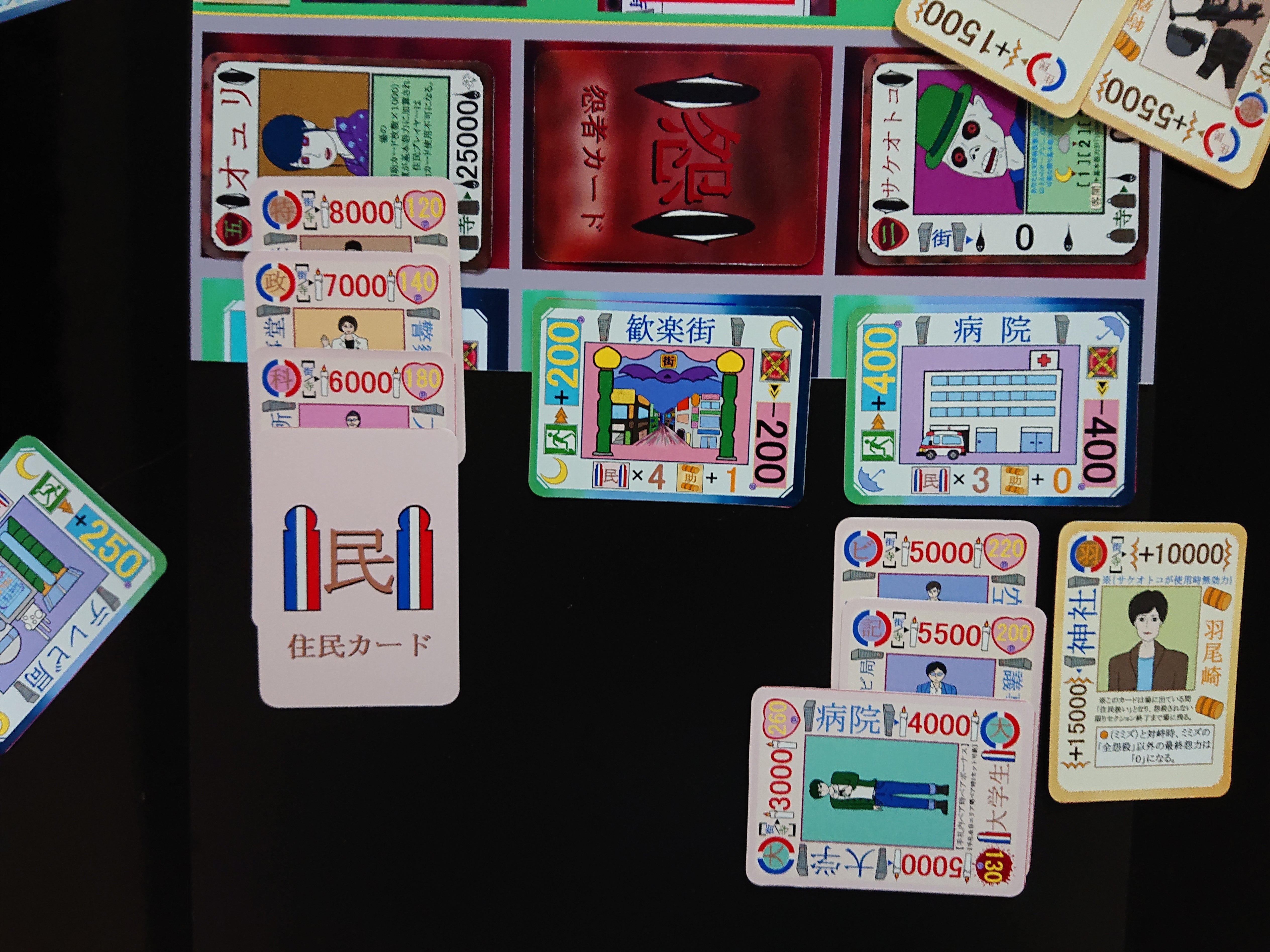 その他の各プレイヤーは「住民役」となって、少ない手札のなかで一ヵ所の「街場」を選択し「補助カード」または「住民カード」を犠牲にしながら「街怨者の怨力値」が「0」になるまで減算していき、1枚でも多く住民カードを街から脱出させ、街カードの「脱出ポイント」獲得を目指します。尚、犠牲になった住民カードは「怨殺ポイント」として怨者役に入ります。もし、すべての住民役が寺に進めなかった場合、怨者の「戌の宴」が始まり、怨者役には高ポイントが入るチャンスが与えられます。