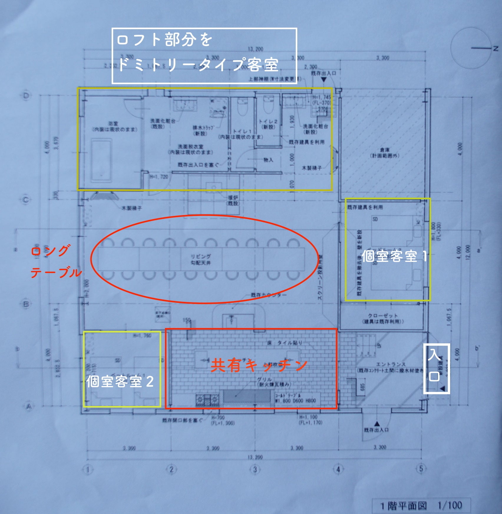 個室が2部屋とドミトリータイプの客室を予定しています