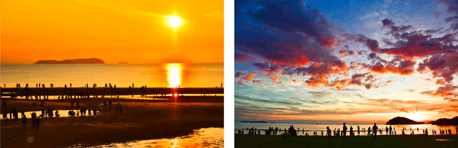 ここまでお店が増え、活性化した大きな要因は目の前の父母ケ浜海岸が【東洋のウユニ塩湖】、「日本一の夕陽」として全国的に有名になったことです