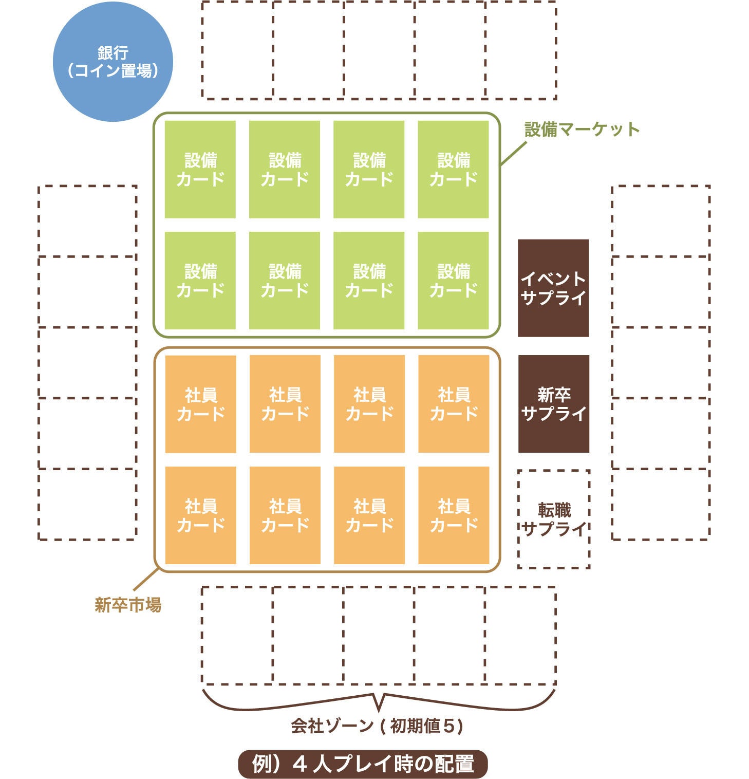 各プレイヤーが雇用フェイズで雇用できるカードを置く場所です。新卒市場に公開される社員カードの枚数は(プレイ人数)×2枚です。新卒市場からカードがなくなり、補充するときも、新卒サプライの上から(プレイ人数)×2枚の社員カードをめくって、新卒市場に公開してください。