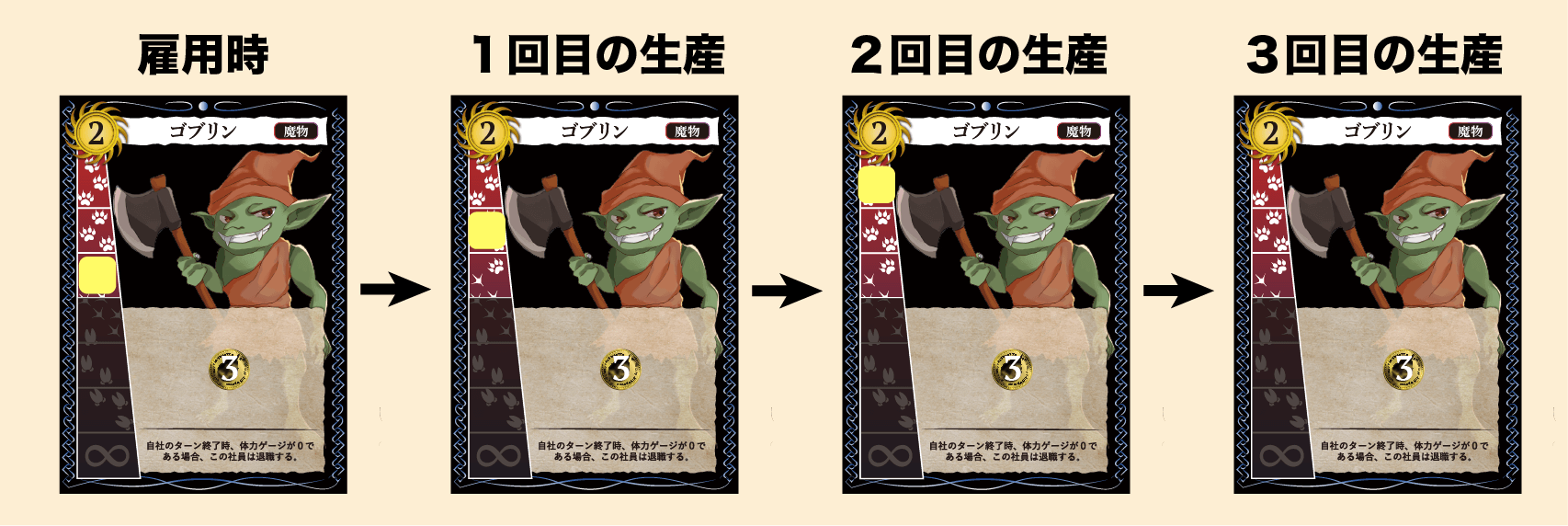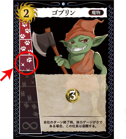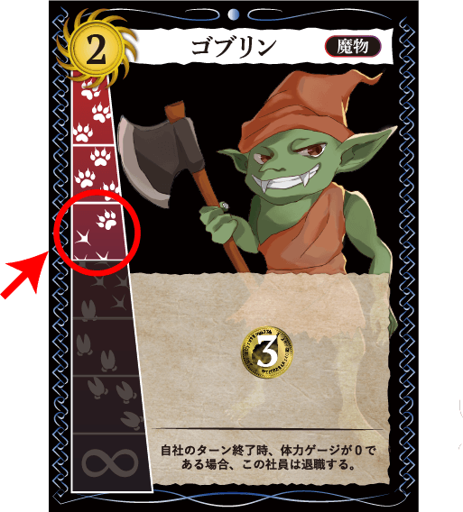 ゴブリンのように、体力ゲージが有限の社員を雇用する時、体力ゲージの最大値部分(左図)にトークンを乗せてください。