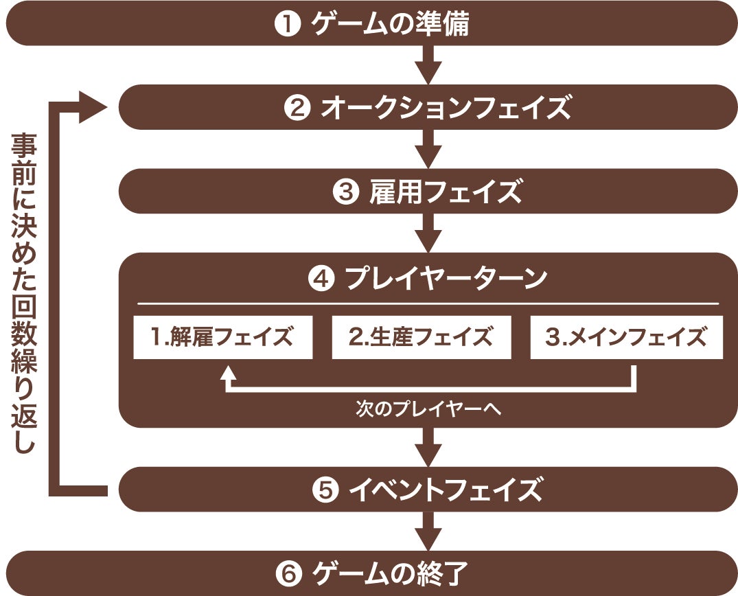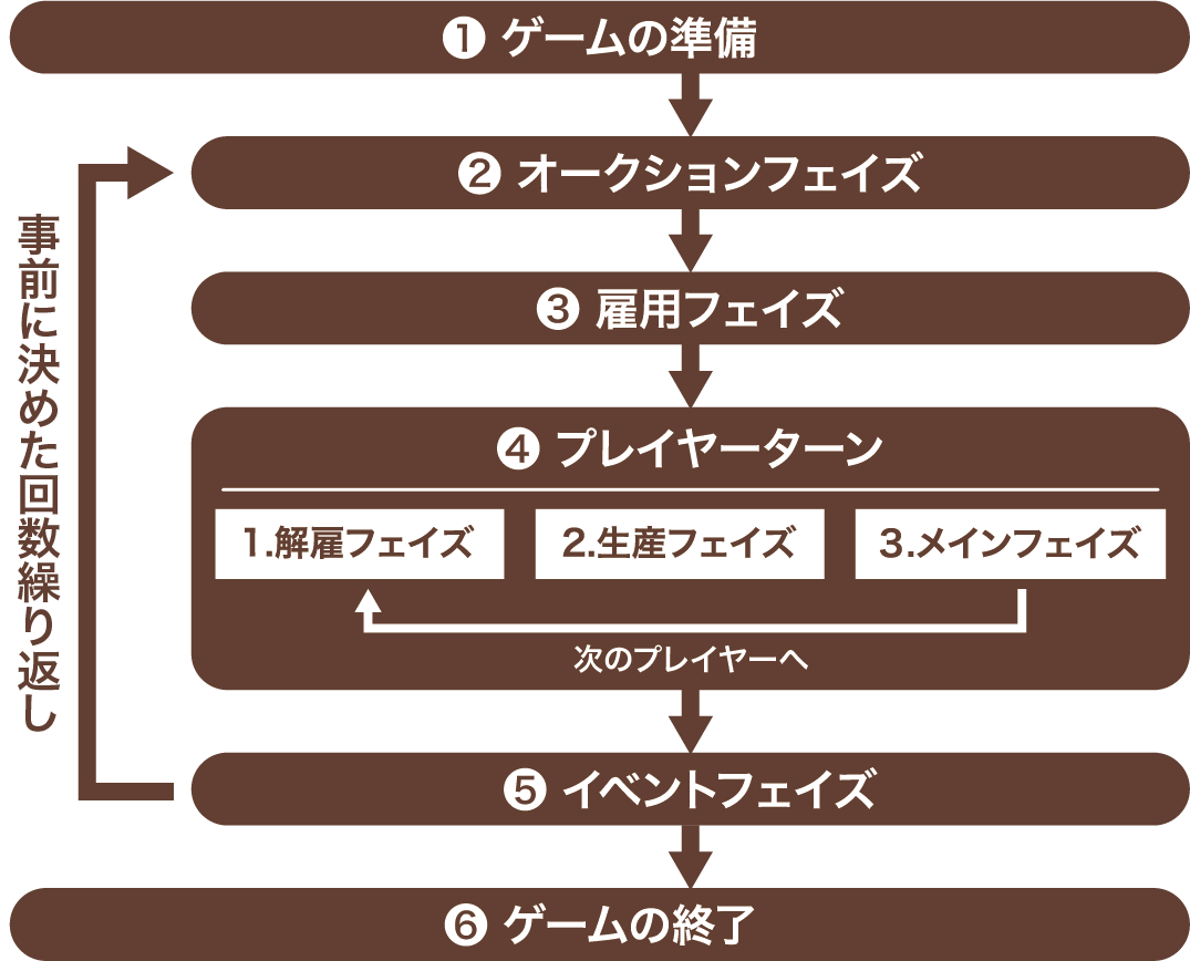 このゲームは1つのサイクル(❷〜❺)をゲームが終わるまで繰り返します。