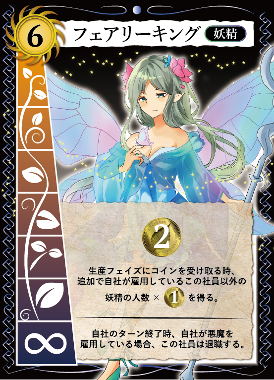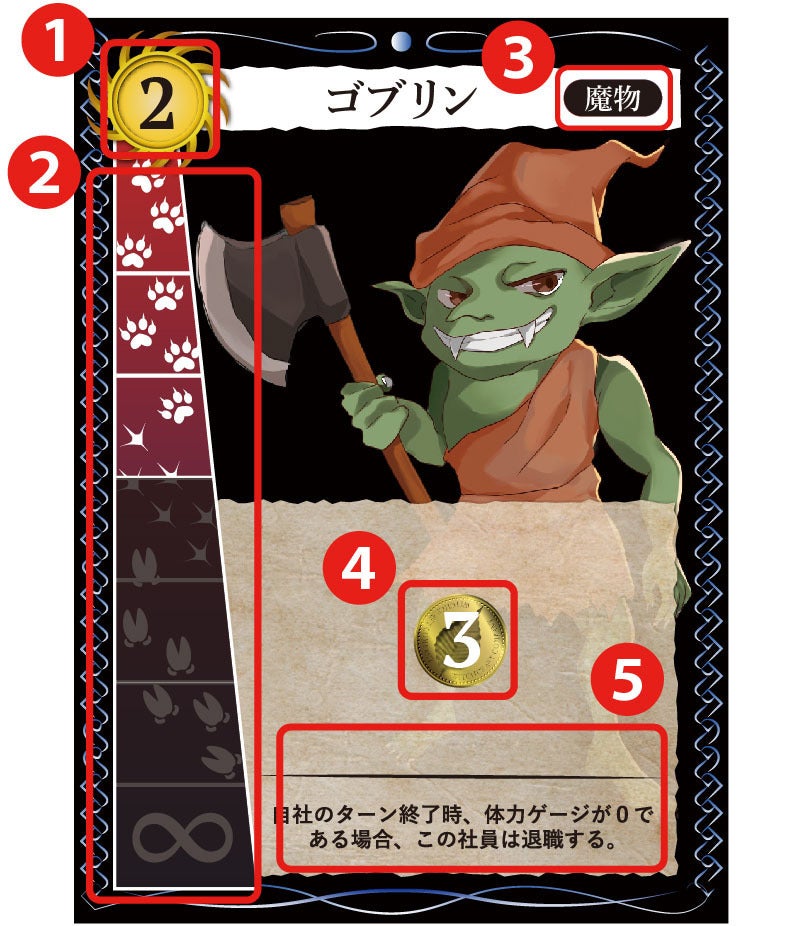 社員カードに書かれている生産力の額(ゴブリンなら3コイン)と、カード効果によって得られる額の合計分だけ、銀行からコインを受け取ります。