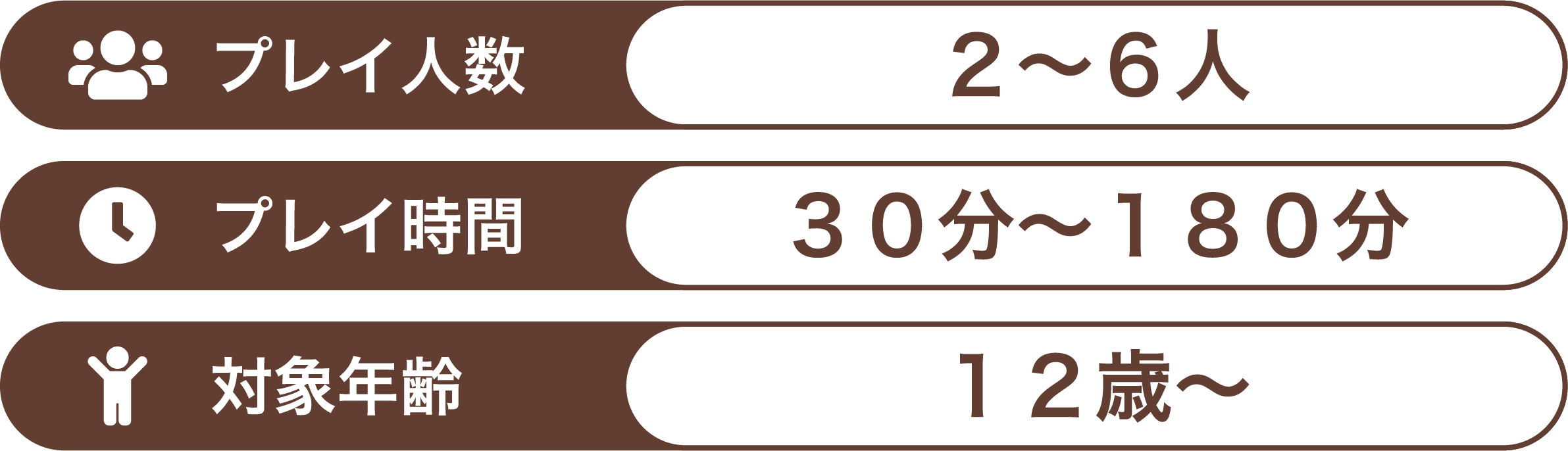 プレイ人数は2〜6人までと幅広く、少人数から多人数まで遊ぶことが出来ます。プレイ時間は、選択するルールや人数によって調節ができます。(後述しますが、おすすめは10ターンのスタンダードルールです。)