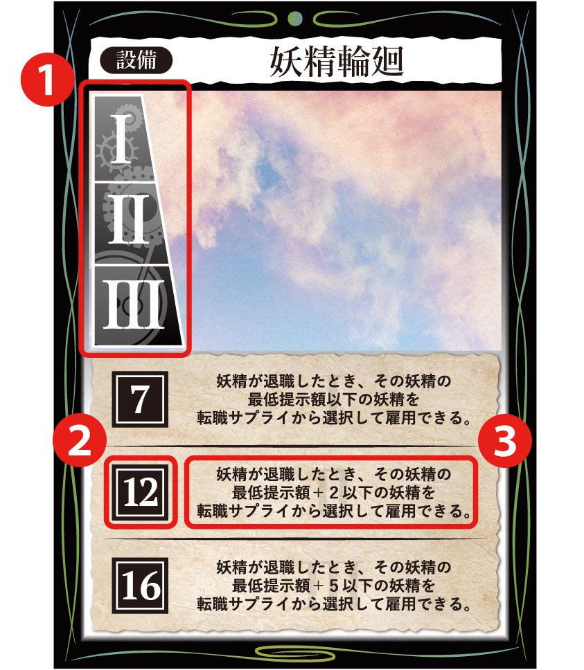 設備のレベルを上げるために必要なコスト(コイン)です。設備を導入する際は、レベル1部分のコスト(左図では7コイン)を支払ってください。