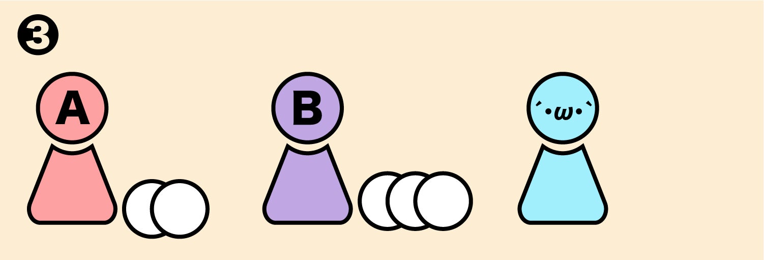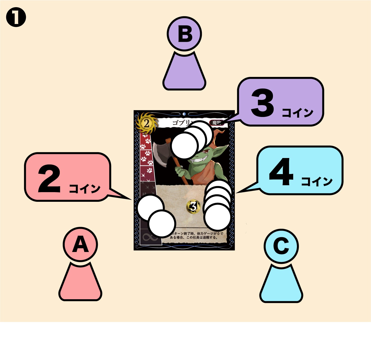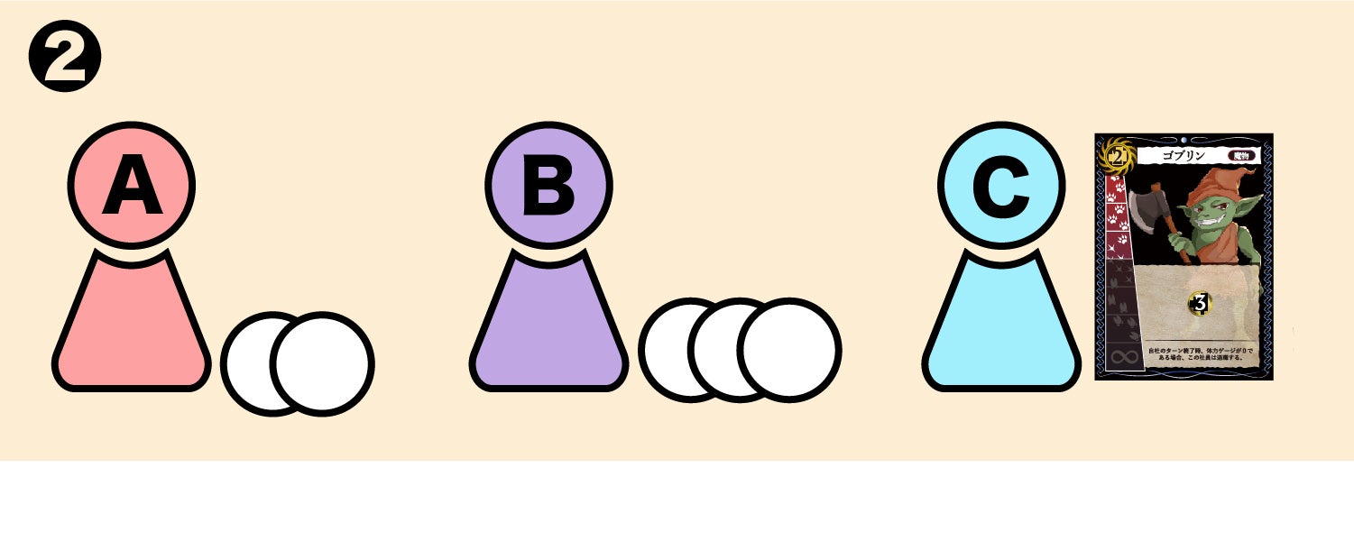 (図❶は、最低ベット額2コインのゴブリンに対してAさんが2コインをベットし、その後Bさんが3コイン、その後Cさんが4コインをベットした、という状況です。)