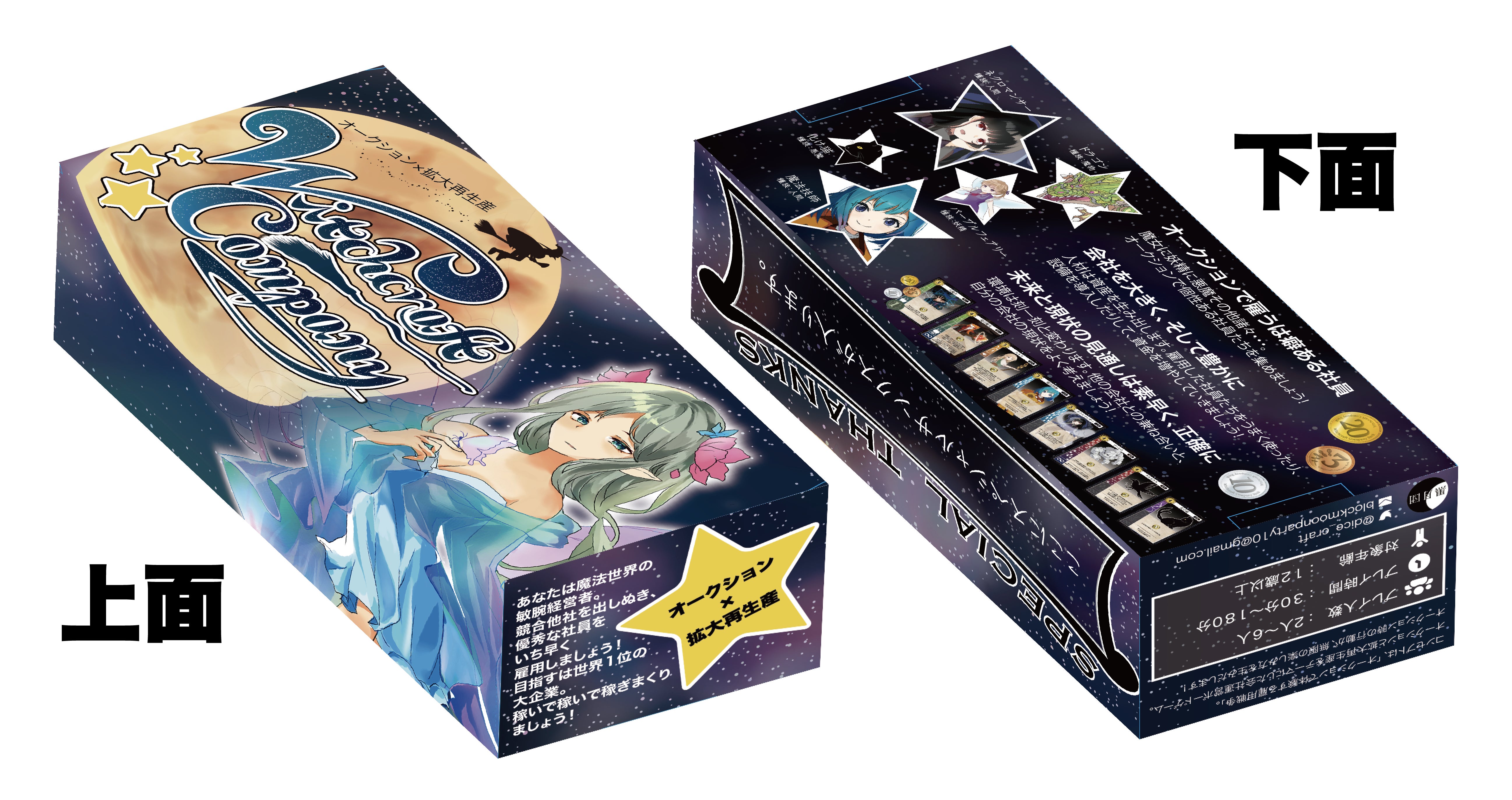 どうも、こたつに封印されし黒月団デザイン担当まっちゃんです。前回の活動報告に引き続き、オリジナルストレージボックスの製作風景をお伝えします。前回の活動報告を見られていない方はこちら月を描く「夜空」「魔女」ときたら月は必須ですよね?!というわけなので、月を作っていきます。下地となる円を置きます。分かりにくいですが、少しグラデーションをつけて立体感を演出します。月の画像を参考にしながらここに柄をつけていきます。さらに影をつけていって……ほんのり赤っぽく、明るくして完成!オブジェクトの配置先ほど作った月を夜空に浮かべます。少し光らせて……うん、いい感じ。ZANEさんの「フェアリーキング」を配置しましょう。可愛いですもんね。さらに、タイトルロゴもどーん。よしよし。ありふれた手法ですけど、黒いシルエットを月の前に配置します。これで箱の上面はできましたね。続いて、箱の裏面や側面をデザインします。必要な文言を忘れずに。最後に裏面を作って……ひとまず完成!ご覧いただきありがとうございました!製品イメージはこのようになります!ただし、あくまでこれは暫定版です。デザインコンセプトは変更しませんが、少し内容をいじったりするかもです。その点、ご了承ください。ここまでご覧いただきありがとうございました。少しでも良いものをお届けできるよう、黒月団一同これからも頑張りますので、応援よろしくお願いします。以上、まっちゃんからでした!