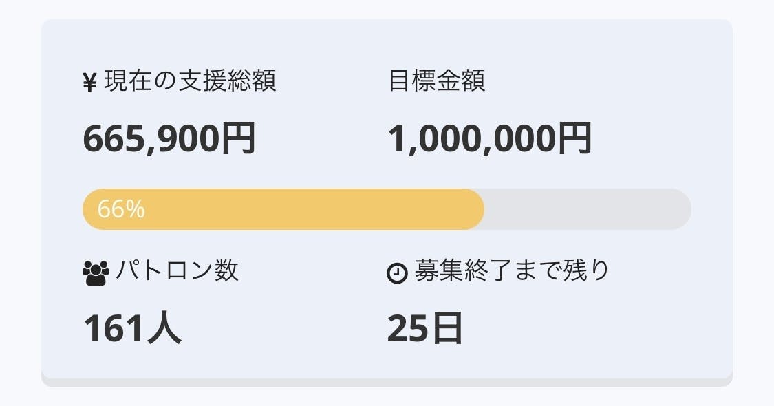 現在、パトロンは161名様、金額が665,900円で、目標金額の66%達成しています!