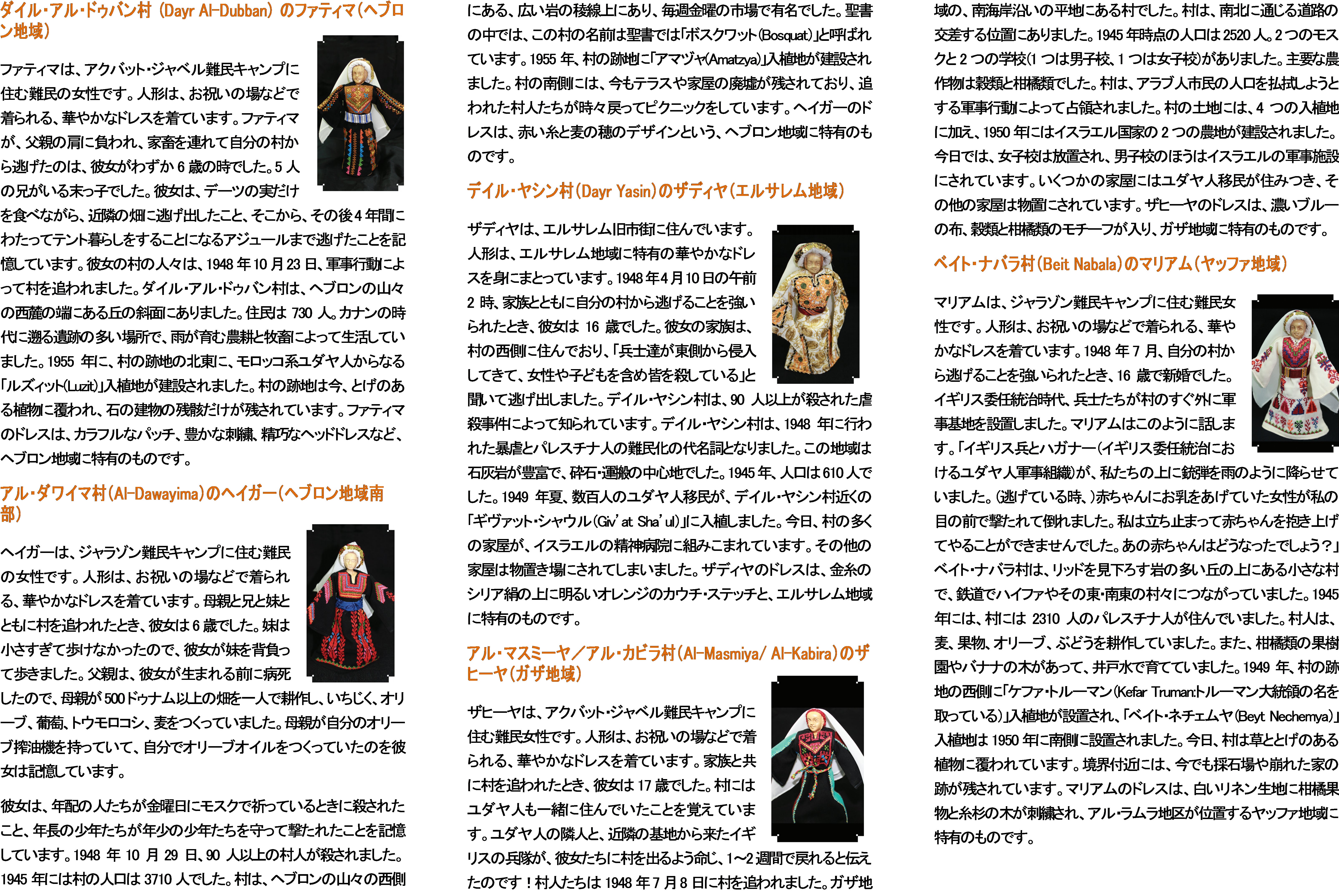刺繍をまとったオリーブの木の人形の女性は、それぞれが地域の代表的な衣装に身を包み、背景の物語を象徴しています。クロスステッチ刺繍は、1948年、70万人以上のパレスチナ人がイスラエルによって故郷を追われ、難民となった「ナクバ(大災厄)」によって失われた村と、かつてそこに住んだ女性たちを反映しています。一つ一つの物語は、難民キャンプに住む女性たちの実際の経験に基づいています。