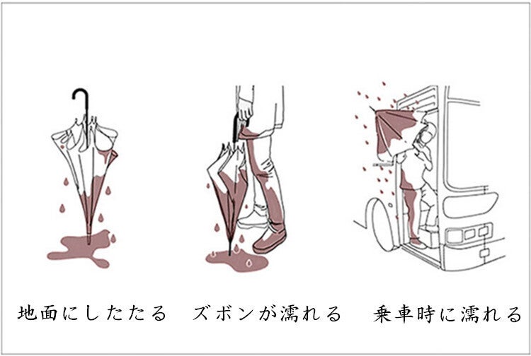 逆折り畳み式傘は濡れた面が内側にくるデザインのため、自動車の乗降時や電車に乗り込むときなど、周りを濡らすことを防止します。 また持ち手を上にして置くと雨水をすっぽり包み込んで床を漏らすことも防ぐことができます。