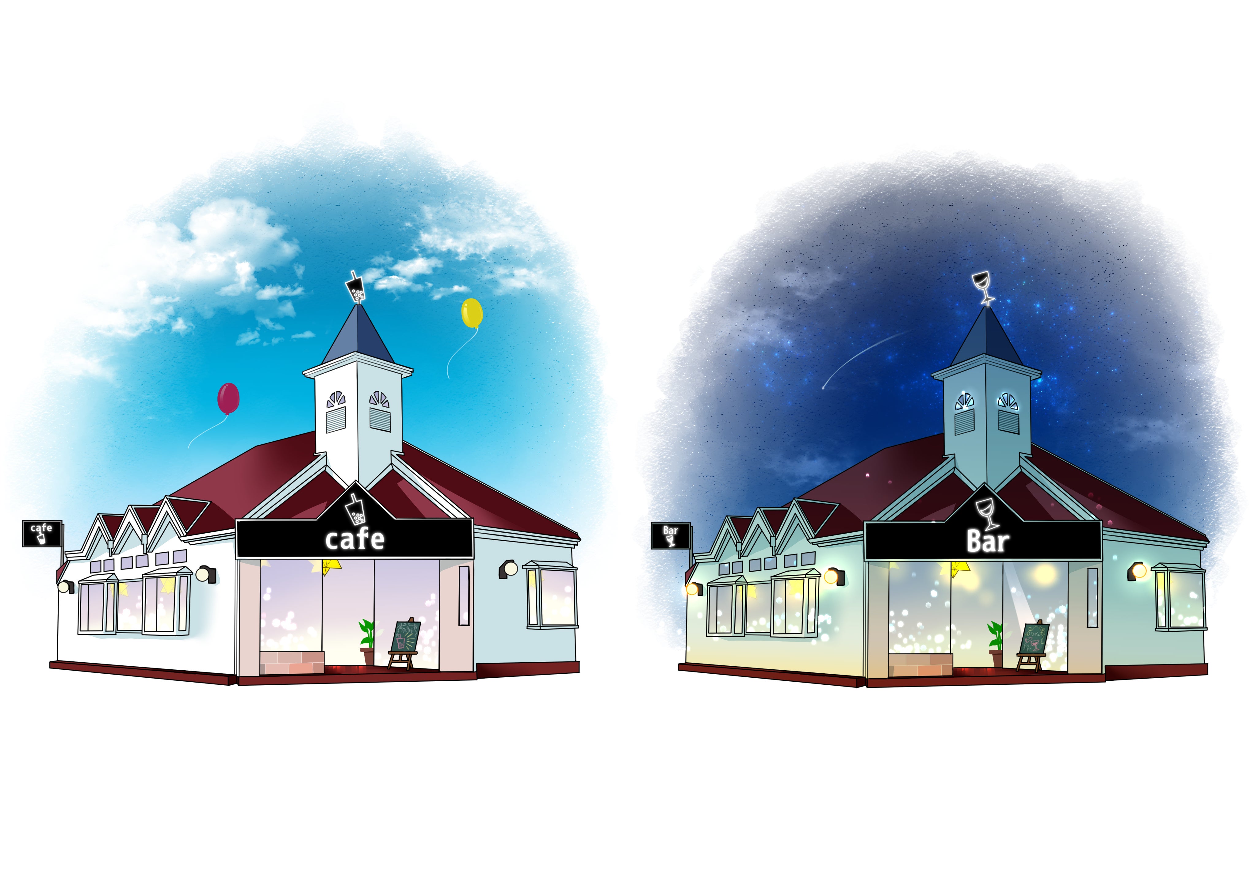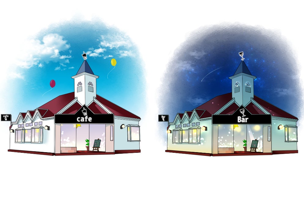 見た目ですが、もちろんまだ無いので写真などでお見せすることはできませんが、外見であれば、カフェとバーで全く見た目も雰囲気も違う看板に切り替わったり、お店のシンボルがカフェのカップからワイングラスに変わってたり。違うお店に変わってしまいます。