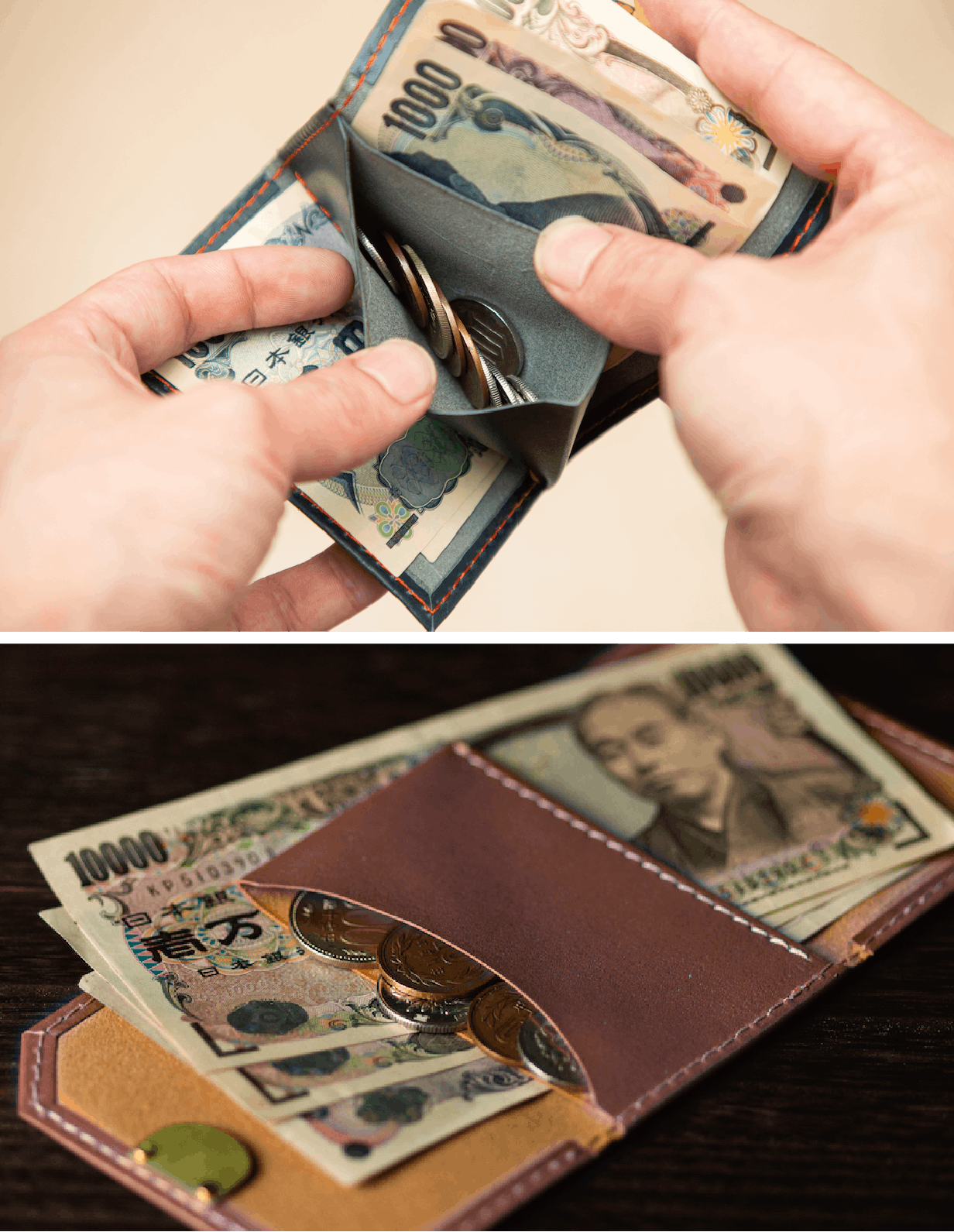 お札も十分に収納でき、カードは4〜5枚を収納できます。ちょっとしたお買い物だけではなく、普段使いの財布としても不自由ないだけのお金とカードを持ち運び可能です。