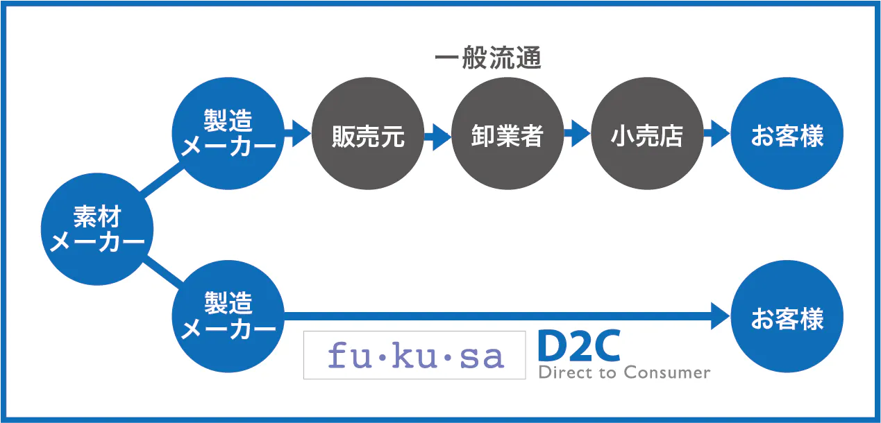 こだわり抜いた高品質の素材と職人の技で仕上げた[fu・ku・sa]をより多くの方に手にとっていただくために、従来の商流ではなく、「D2C(Direct to Consumer)」という形をとって中間マージンを極力カットしました。