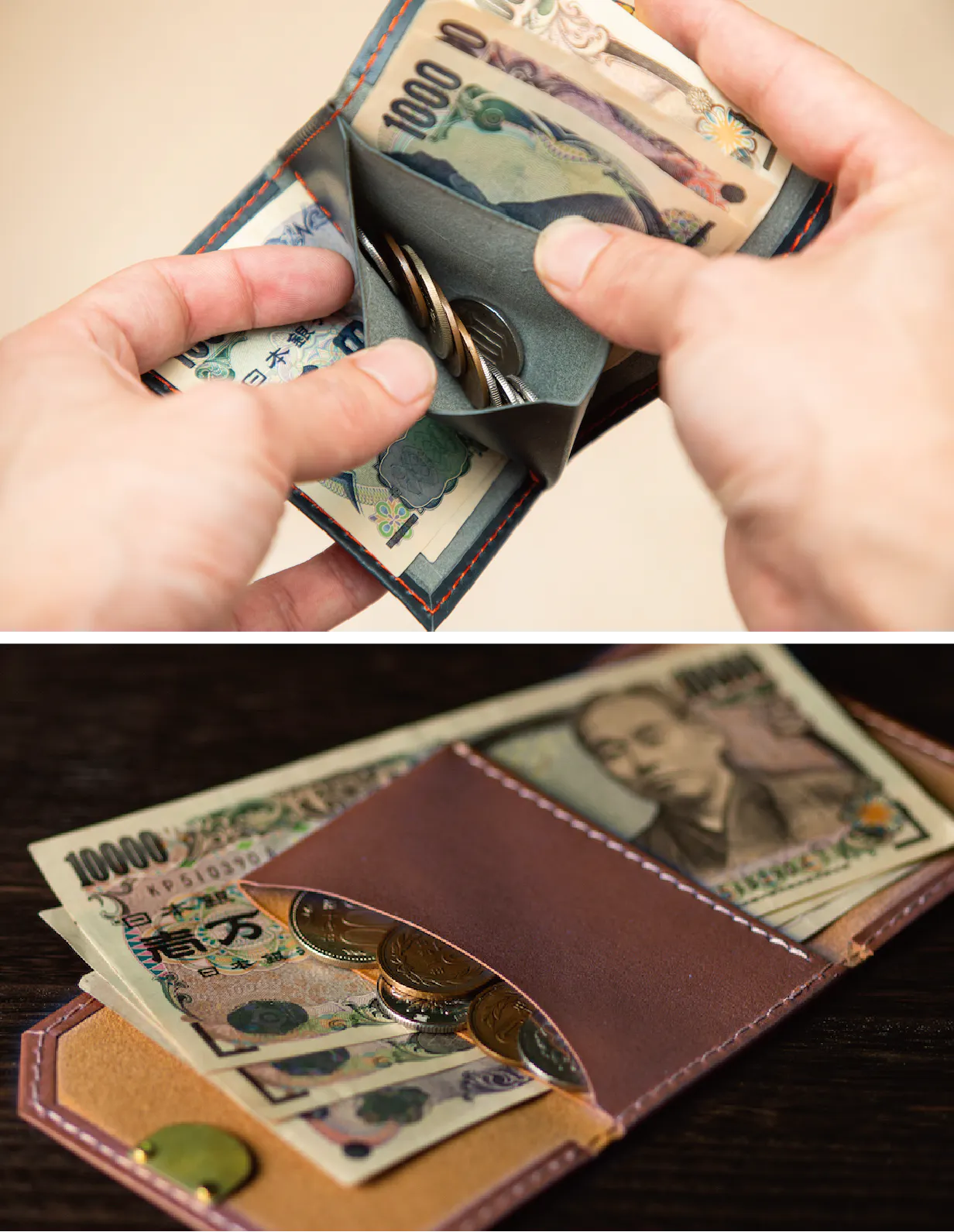 中央部分にあるポケットは、カードだけではなく小銭入れとしても活用できます。あなたのライフスタイルに応じて[fu・ku・sa]は自在に適応します。