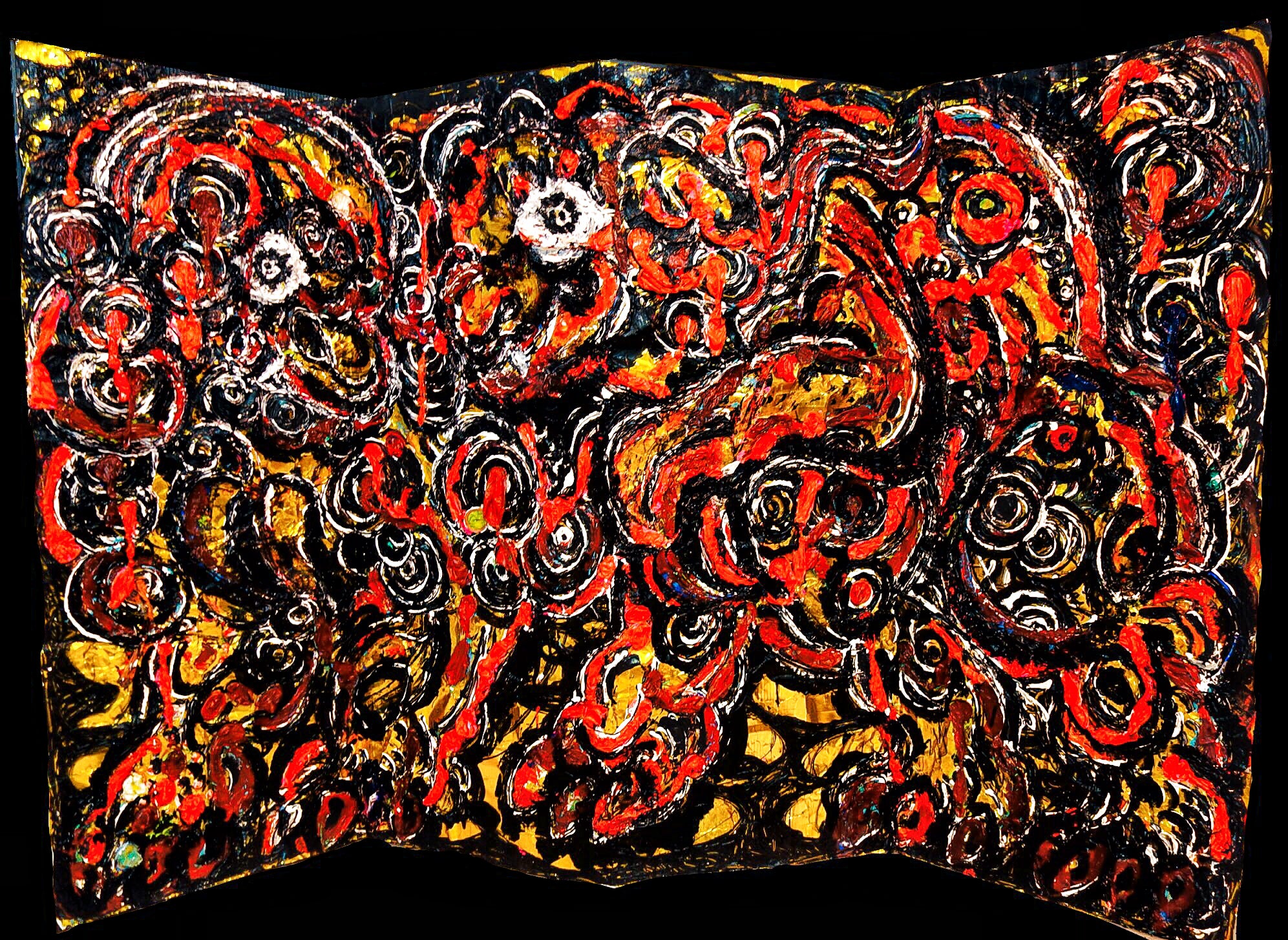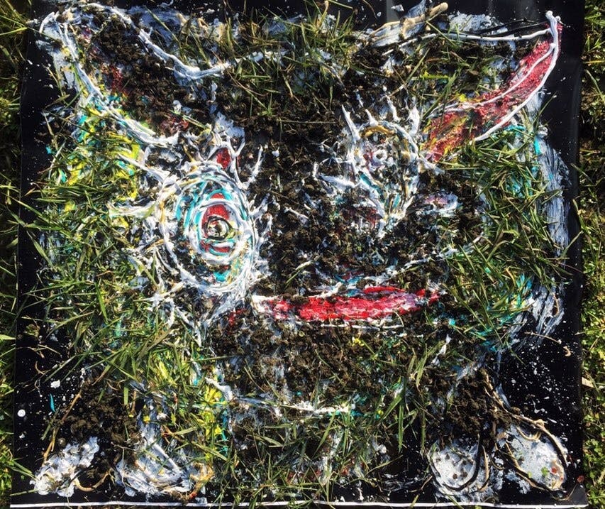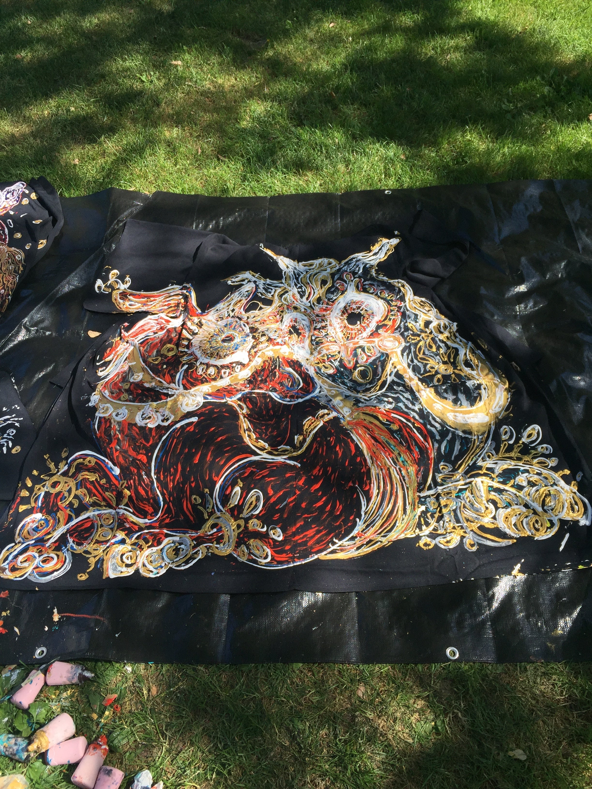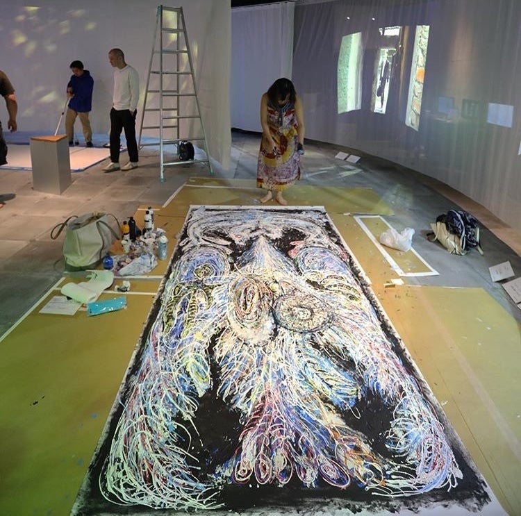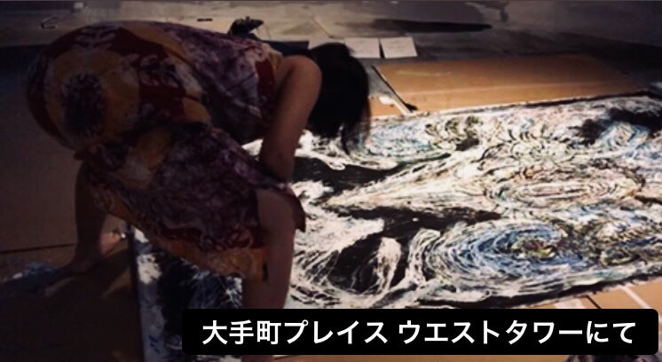 砂や絵の具を、飛び散らせながら本能のままに描きます。