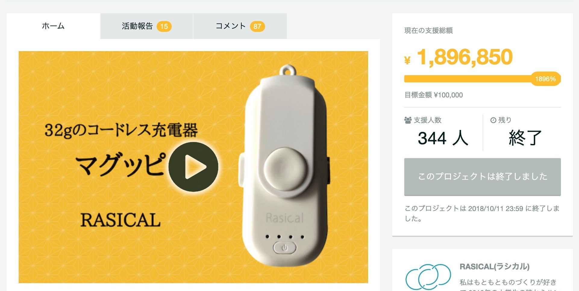 ラシカルが企画した製品、アクションカム「RA3R」はわずか1年間で5000台以上出荷しました。また、2018年7月にミニマリスト向けの製品「ユニコーン」バックパックは3000万円近く支援金が集まり注目を集めました。