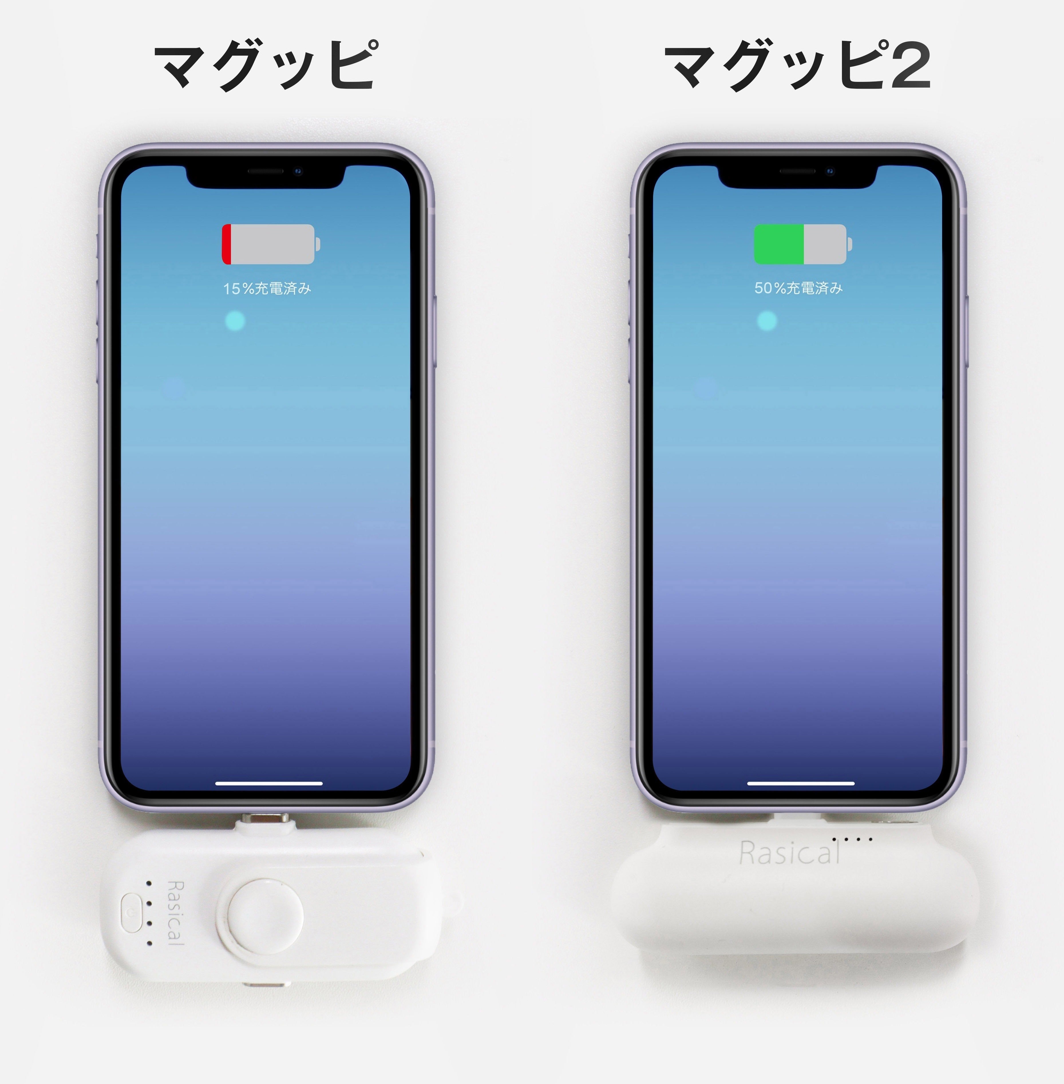今回は2.6倍の2,600mAhに変更しました。iPhone11で測定した所、「従来のマグッピ」では15%ほどしか回復しないですが、「マグッピ2」では50%も回復します。実用性の高い製品に仕上がっております。