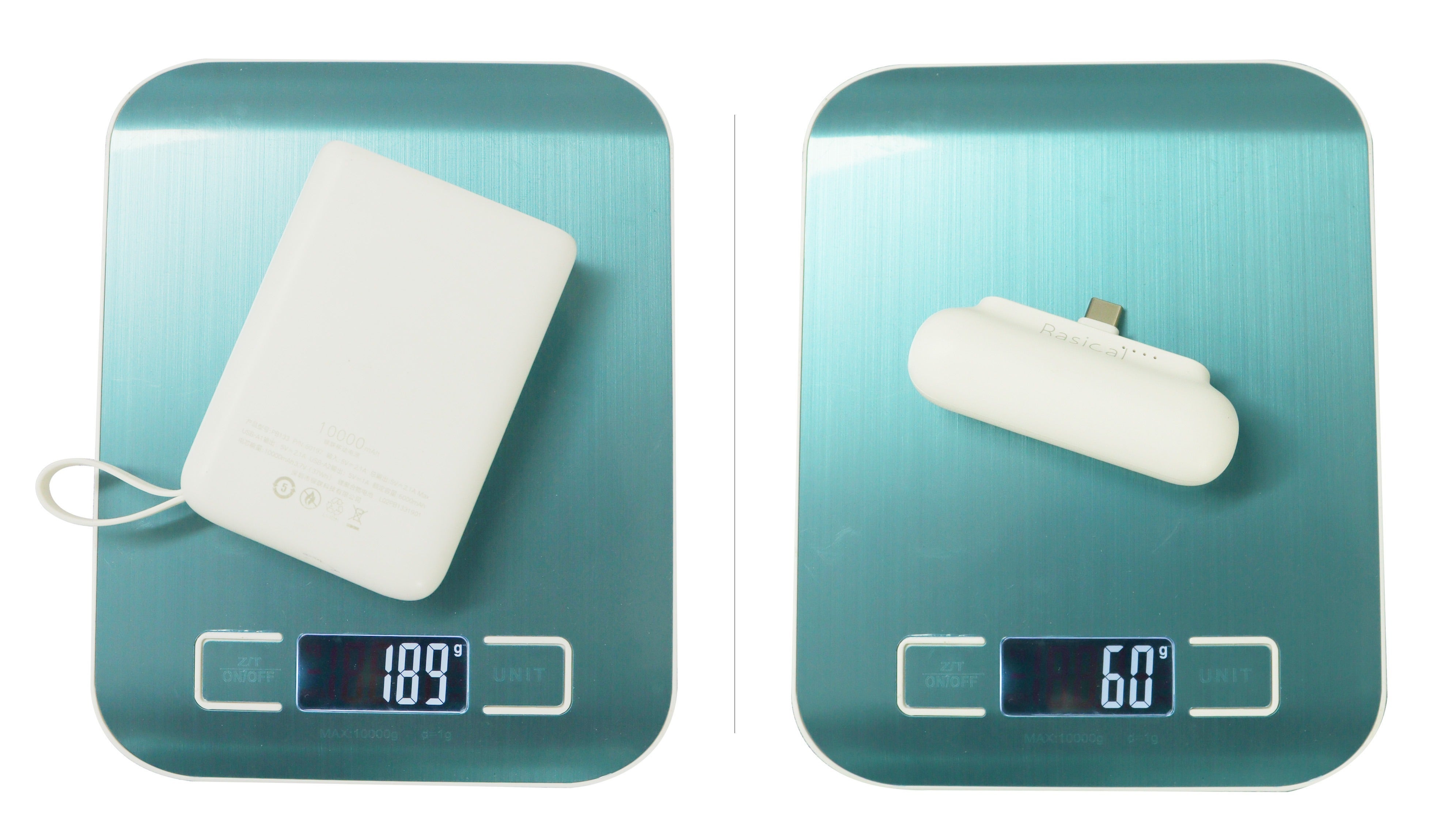 「マグッピ2」は容量が2,600mAhに増えましたが、重さは60gしかありません。ある人気ブランドの10000mAhモバイルバッテリーと比較すると、どれだけ軽いかもはっきり分かります。出張でも旅行でも「マグッピ2」だけで十分です。