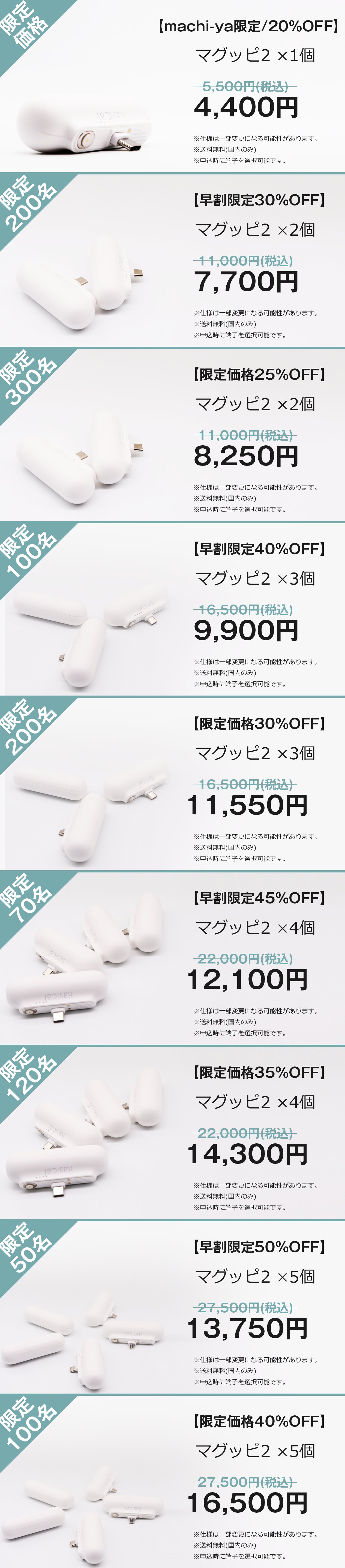 『マグッピ2』は、今までのマグッピよりも容量増量、接続安定を実現したケーブル不要のミニマム充電器です。重さは60g、今の時代には十分の容量2,600mAh。日帰りなら、ポケットにこれ1つで十分という設計にしてあります。長時間酷使する人でも、スマホ1台だけのためなら、大容量のバッテリーは必要ありません。これ一つで十分です。
