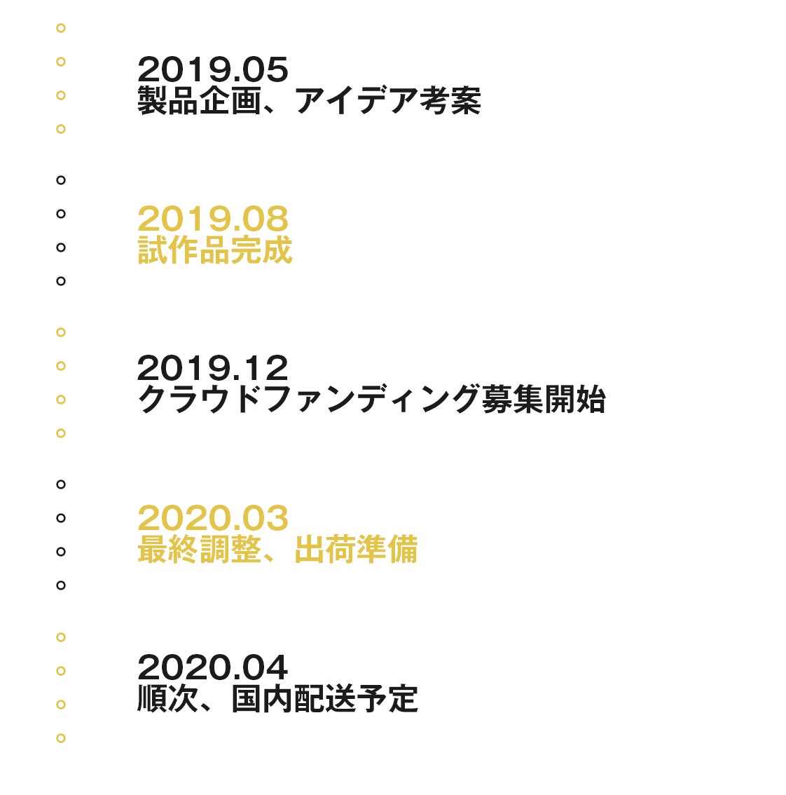 本製品は量産に一切の問題はなく、プロジェクト成立移行はできる限り早くお手元に届けられるよう努力いたしますが、想定を上回る大量のご注文時や素材供給に時間が必要な場合など予期しないトラブル、また物流事情などで遅延が発生する場合がある点についてはご留意ください。
