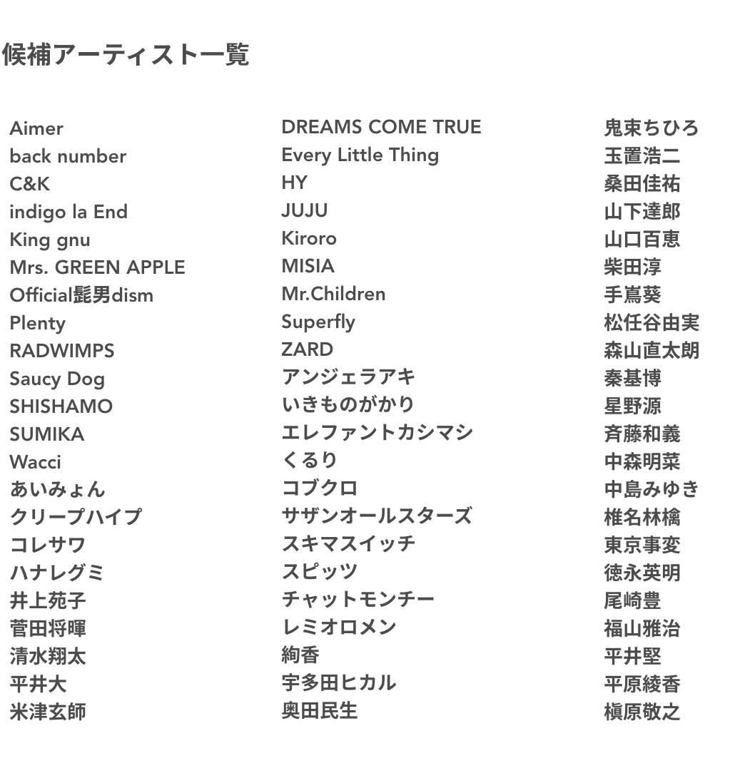下記の候補アーティスト一覧からアーティストを選び、リクエストする楽曲情報(アーティスト名・楽曲名)を備考欄にご入力ください。