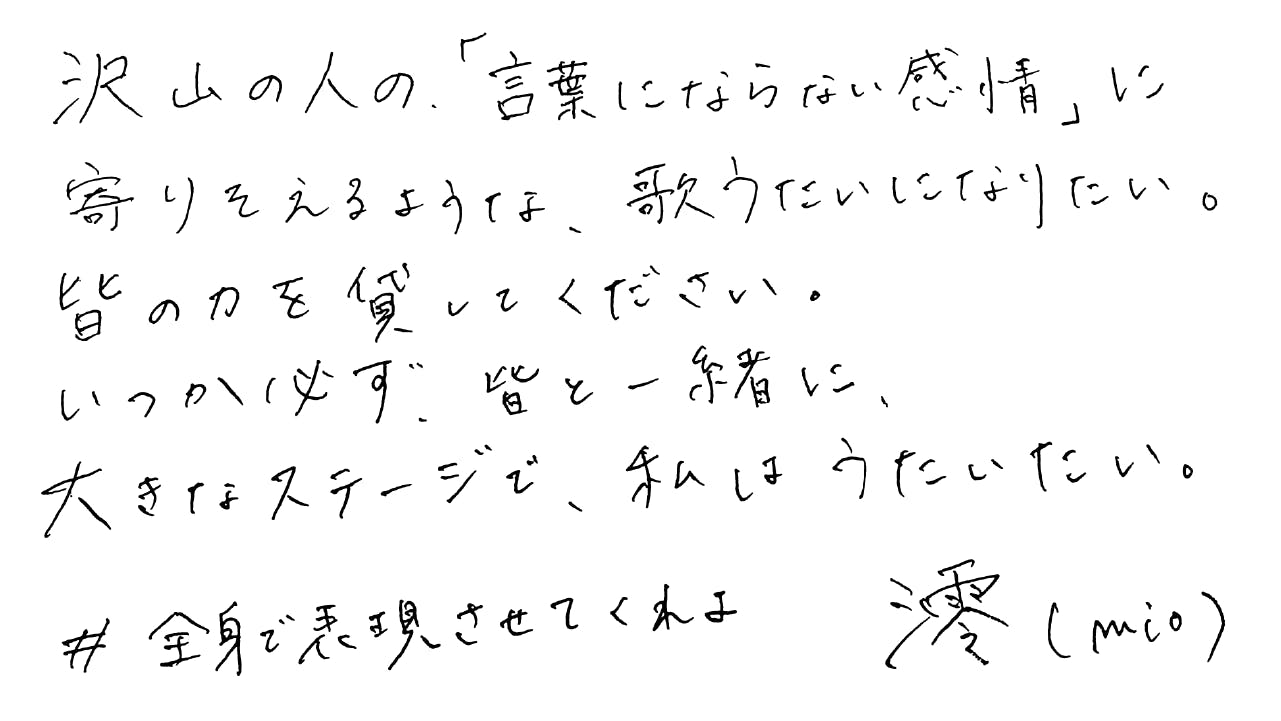 募集終了後のコメントを失礼いたします。 つい先日、YouTubeにて澪さんのチャンネルに出逢い、澪さんの存在を知りました。 アップしていただいた曲を全て聴かせていただきました。 澪さんの丁寧なうたい方、曲に応じたブレスや情景に合った声など細部にまでこだわる伝え方、表情の作り方、その全てを通して感情に訴えかけてくるような、澪さんが作り出す世界観にとても感銘を受けました。 その後、クラウドファンディングを募集されていたことに気が付き、ぜひ応援させていただきたいと思いましたが、すでに募集が終了しておりました。 もう少し早く出逢えていればと思うと残念な気持ちでいっぱいです。 今回のクラウドファンディングの応募に関わらず、今後、澪さんを応援させていただくことはできますし、もちろん応援させていただきます。 ただ、どうしても諦めがつかず、ファンカードプランとオリジナルグッズコンプリートプランに応募したく、今からの別の方法での受付をご検討いただくことはできないかと思い、コメントさせていただきました。 私自身、わがままで大変厚かましく、ご無礼なコメントである事は重々承知しております。 しかし、僅かながらもまだチャンスがあるならと思い、今回コメントさせていただきます。 いつも素敵なうたと感動をありがとうございます。 これからも全身で表現してください。 今後、澪さんのさらなるご活躍を願っております。 そして、これからも応援させていただきます。