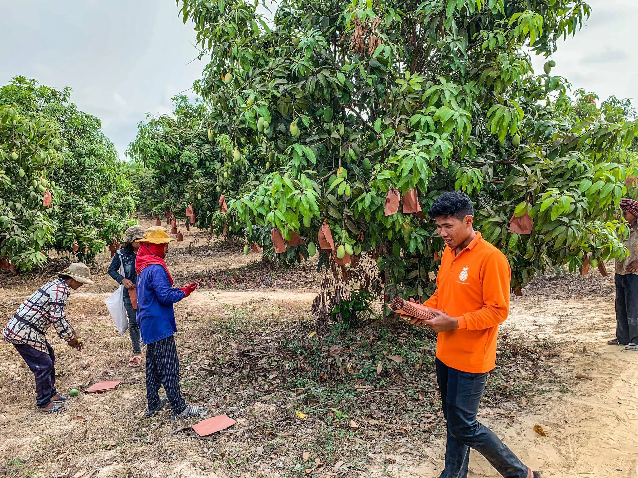 ファームメンバーは通常の業務があるため、マンゴーの袋掛けのためにSvayChek村の人たちに臨時でお手伝いに来てもらっています。