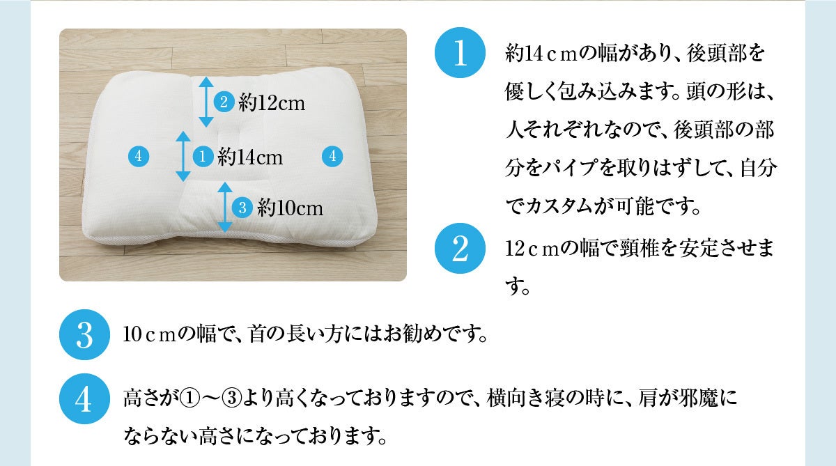 ①頭部を支える部分は、クボミ構造になっており、優しく頭を支えます
