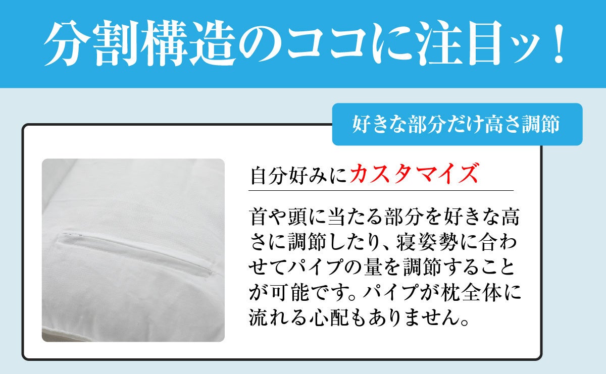 低反発シートを外して、ファスナーからパイプを抜いて自分だけの枕にカスタマイズ。お好きな高さに調節する事で、快適で質の良い睡眠を。セミオーダー枕をお試し下さい。