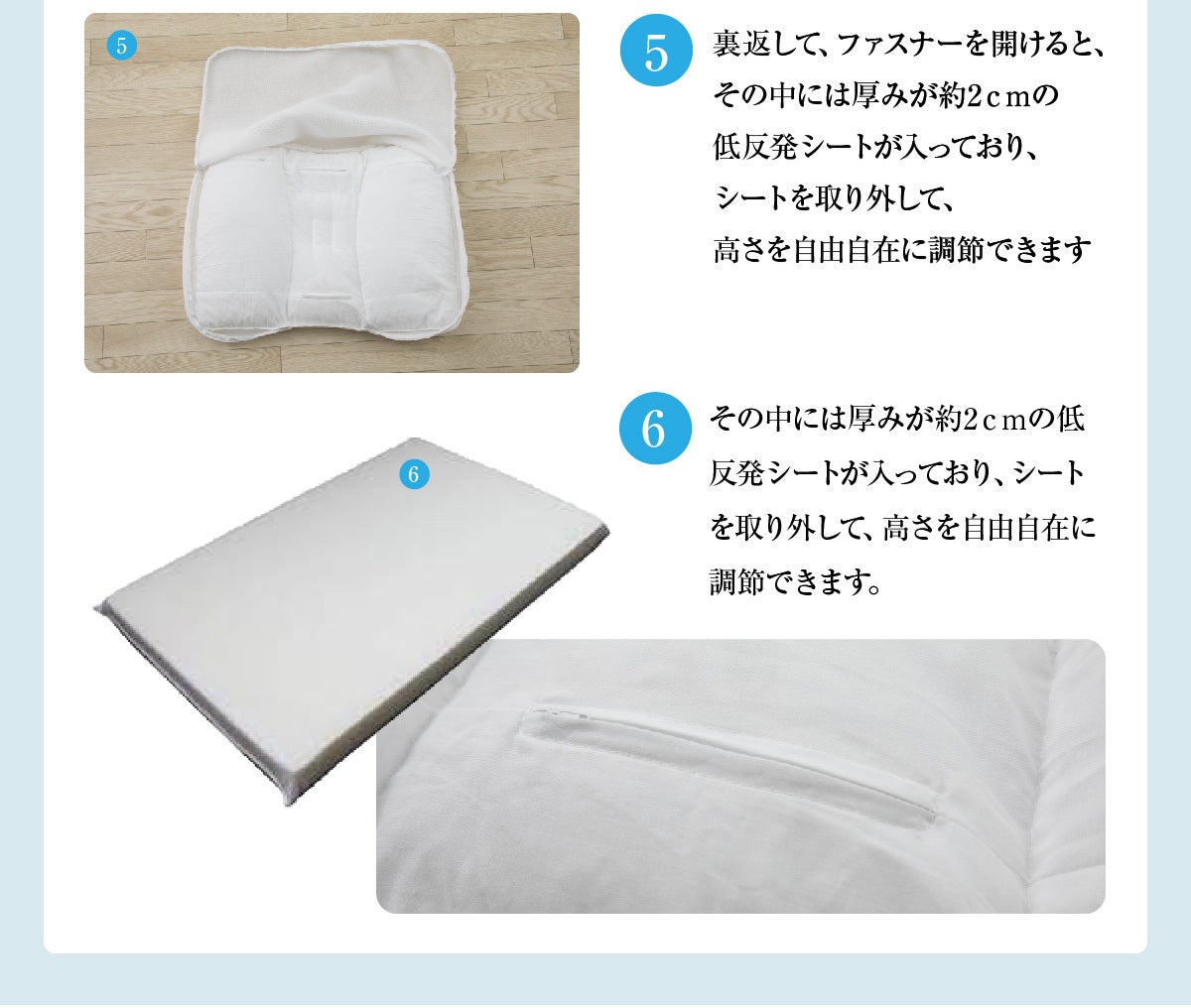 裏側は約2cmの高さの低反発シートがセットしております。弾力性があり、質の良い睡眠をサポート。コの字ファスナーになっておりますので、低反発シートを外して、簡単に低くしてご使用頂けます。パイプを抜いて、低反発シートを入れて、パイプで低くし、低めの弾力性のある枕としてご使用頂けます。