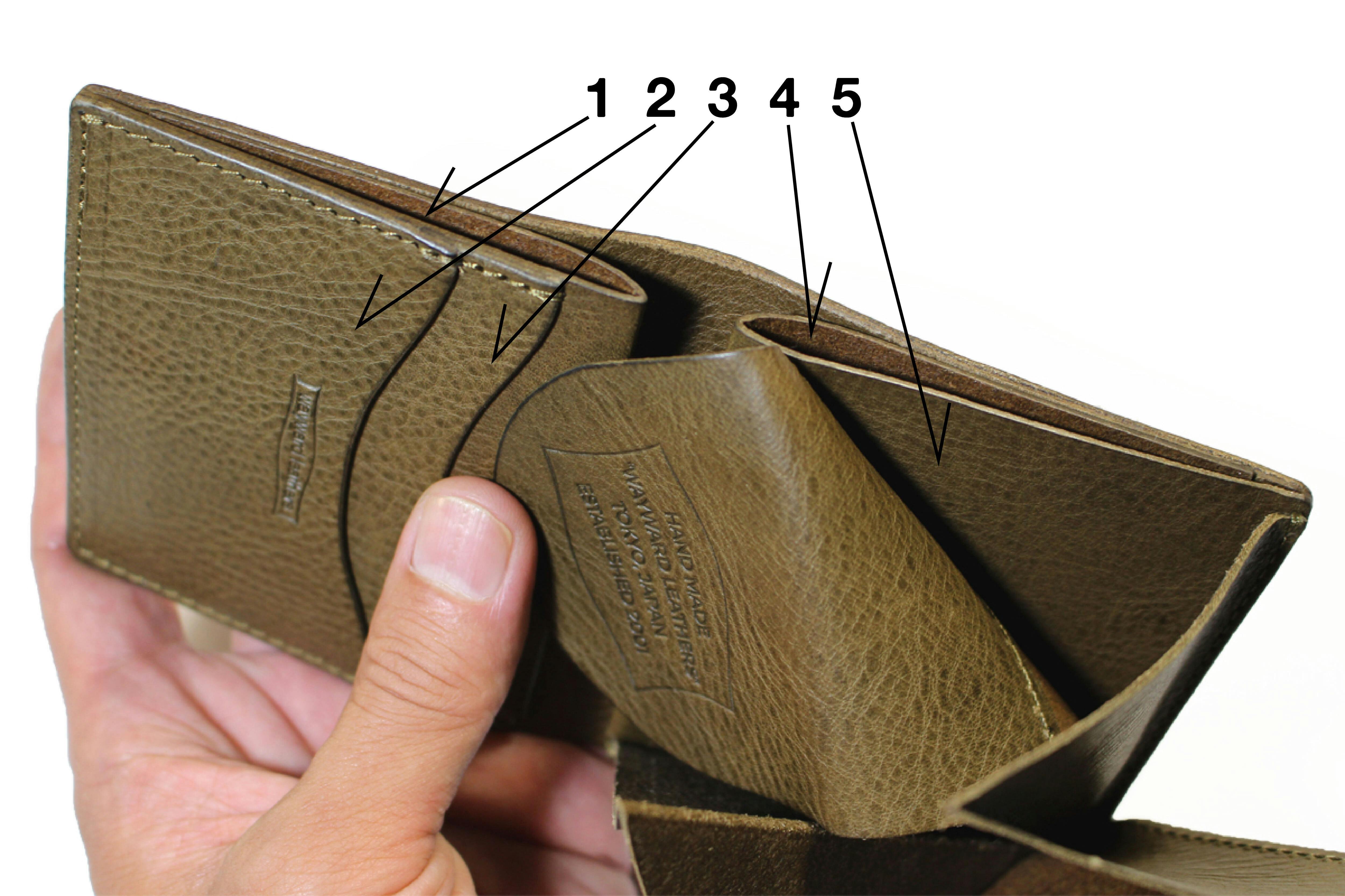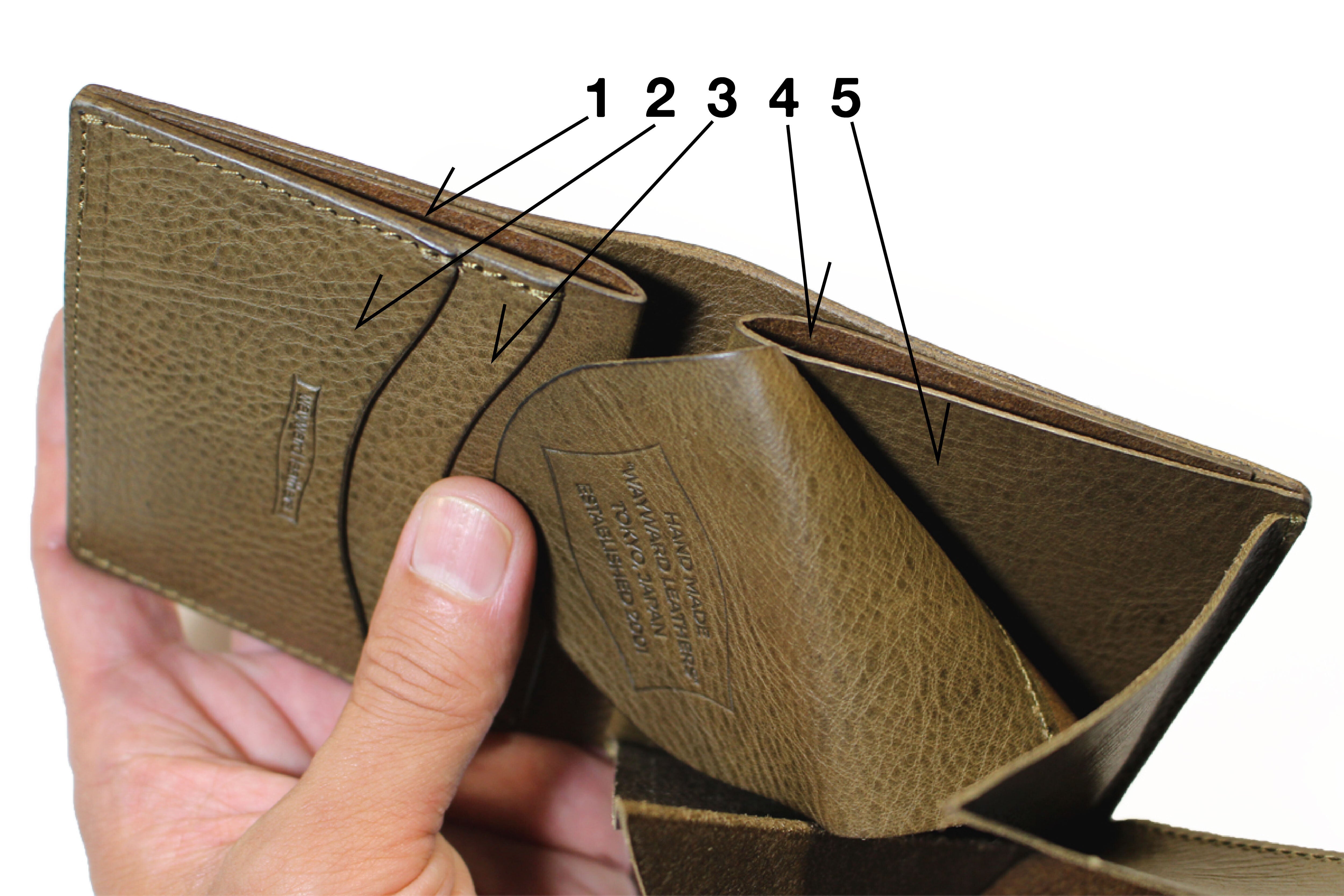 カードスロットは全部で5つ。毎日の生活に絶対的に必要な ①銀行カード、②クレジットカード、③交通系カード、④免許証、⑤保険証 を収納できます。