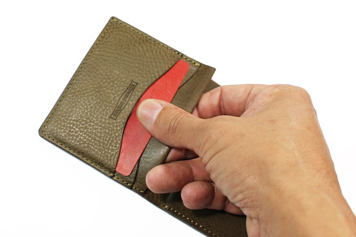 使い始めは少しキツめですが、使っているうちに革がなじんでスムーズに取り出せるようになるのでご心配なく。