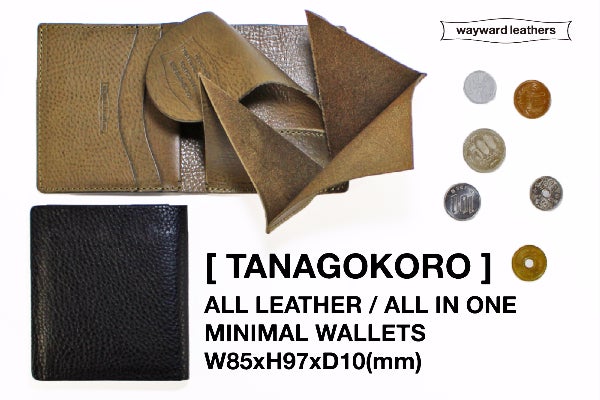 「TANAGOKORO」はファスナー、ボタン類の金具を一切使っていません。これにより、まるで紙のような薄さを実現しました。パタンと折り畳んでポケットに入れて持ち運べば、小銭が落ちることはありません。