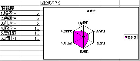 また「図2サンプル2」の例では、「図1サンプル1」とは逆に、レーダーチャート左半分の期待度が高く、右半分が低い事を示しています。