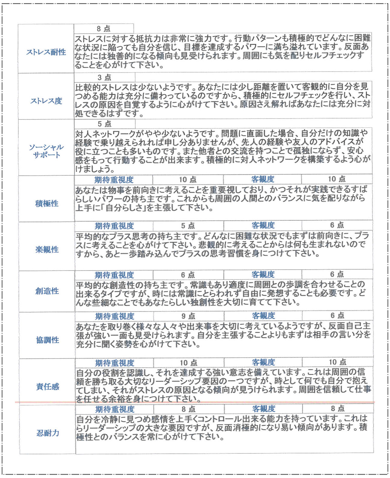 強いて申し上げれば協調性(9:6)の乖離が若干目立ちますが、それらを補って余りある積極性(満点:満点)、責任感(満点:満点)を獲得しています。