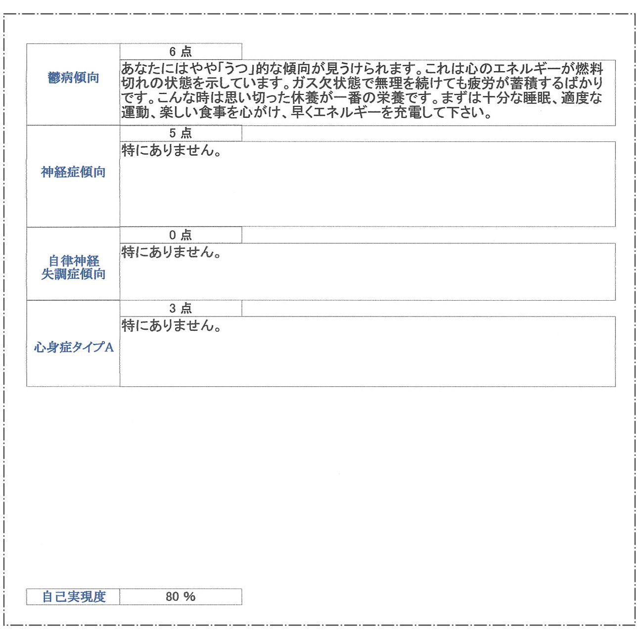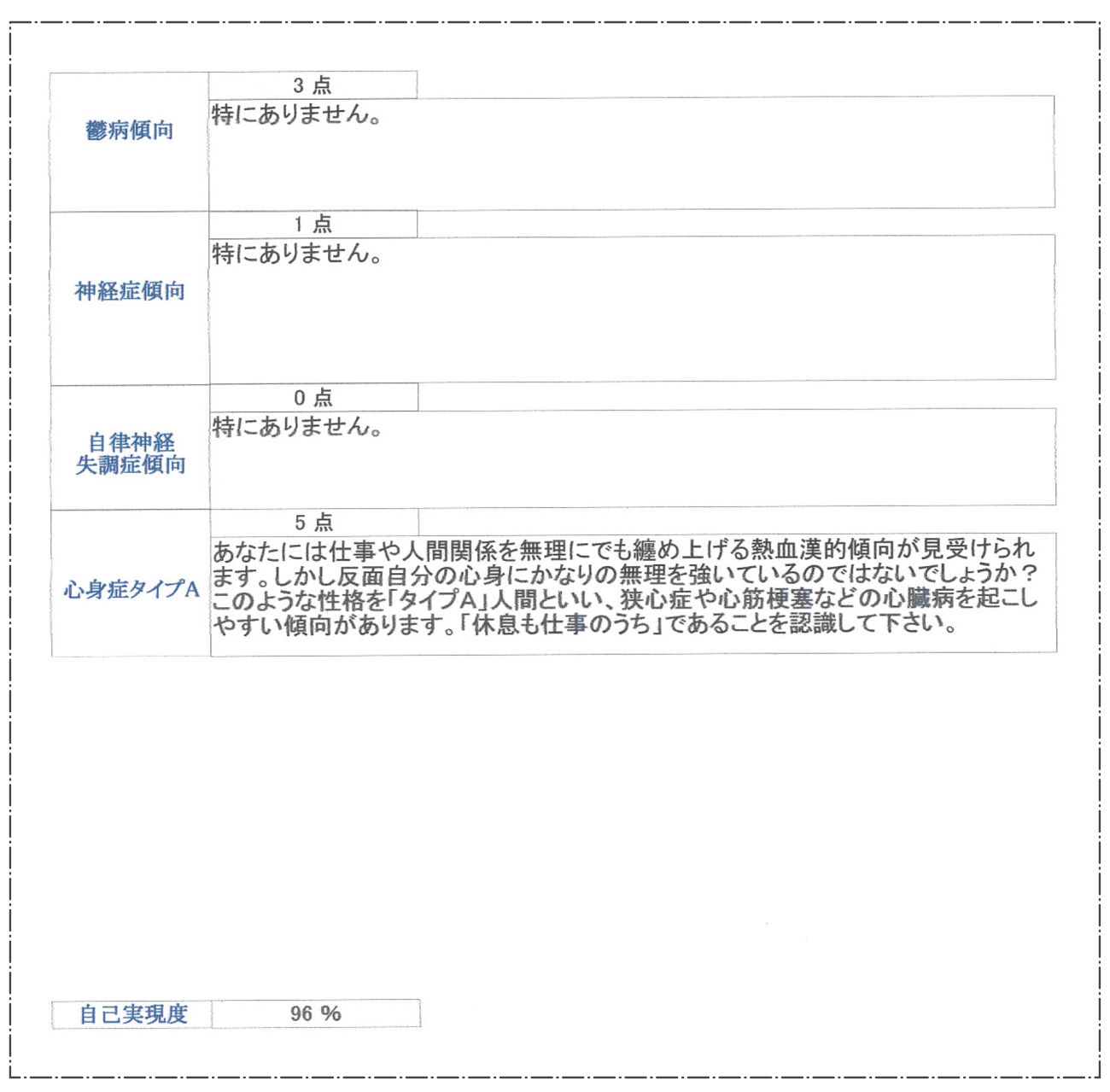 B様の場合、うつ病傾向(3点)がやや気になるレベルですが、これは積極的な解釈として、これだけの高邁なる自己実現を獲得するために当然の如く経験したであろう魂の傷跡と拝察します。