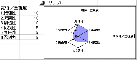 例えば、図1のサンプルでは、レーダーチャート右半分の期待度が高く、左半分が低い事を示しています。