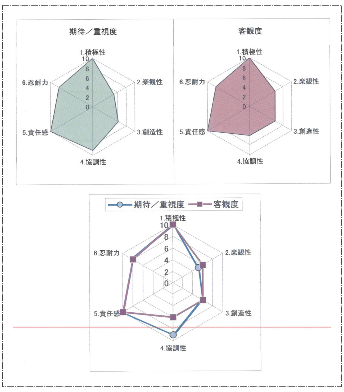 逆に評価点数が低いほど「それほど重要に思っていない。」ことを示します。従って「期待・重視度」のレーダーチャートグラフは「あなたがなりたい自分」、「自分はこうゆう人間でありたい」という理想像を示します。