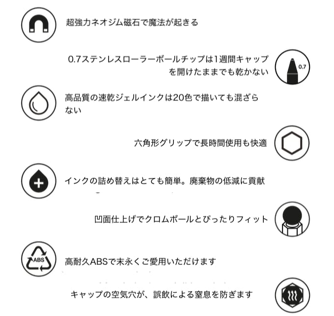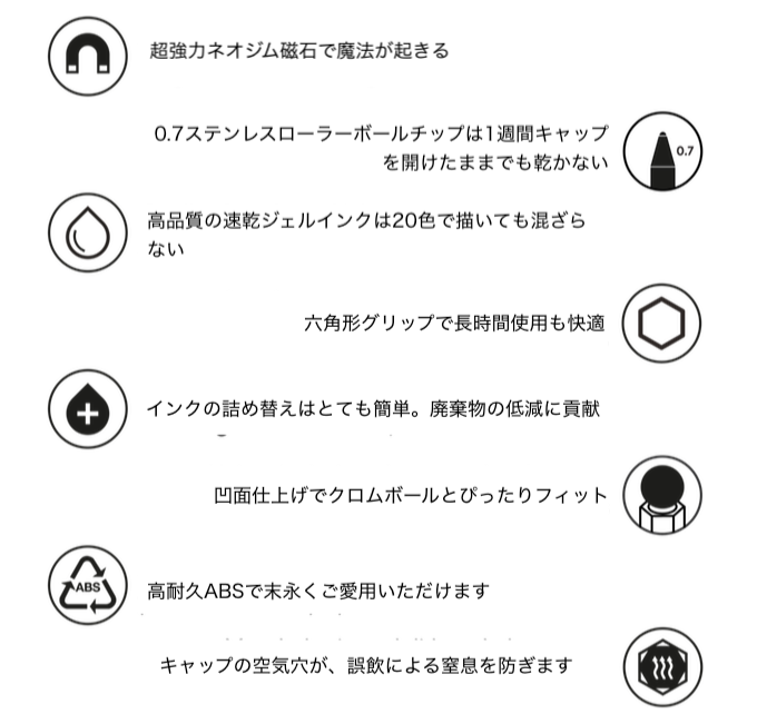 1本1本のペンに、軸方向に磁化された超強力なネオジム磁石を内蔵。ネオジム磁石は地球上で最も強力で最も永久的な磁石の1つです。