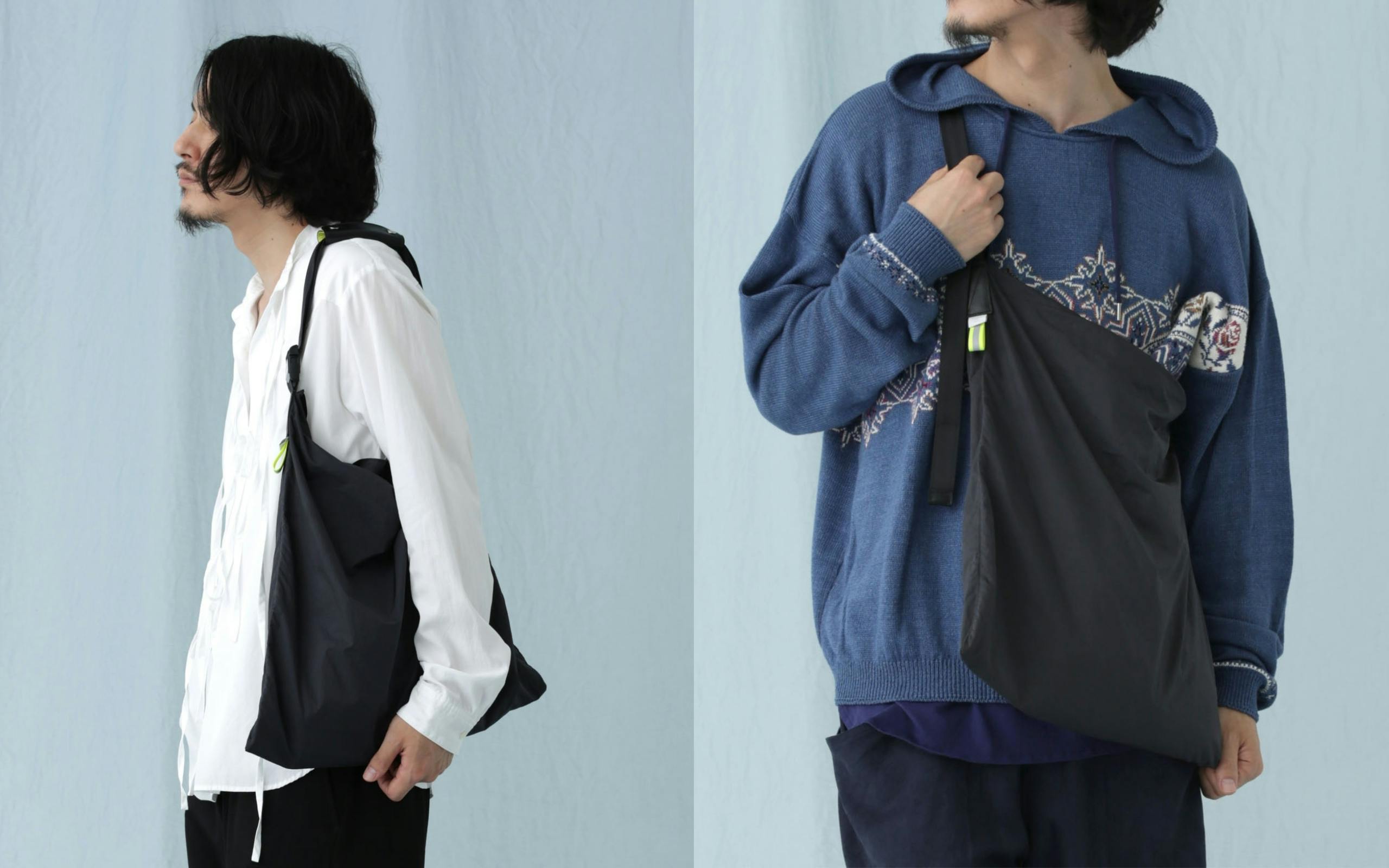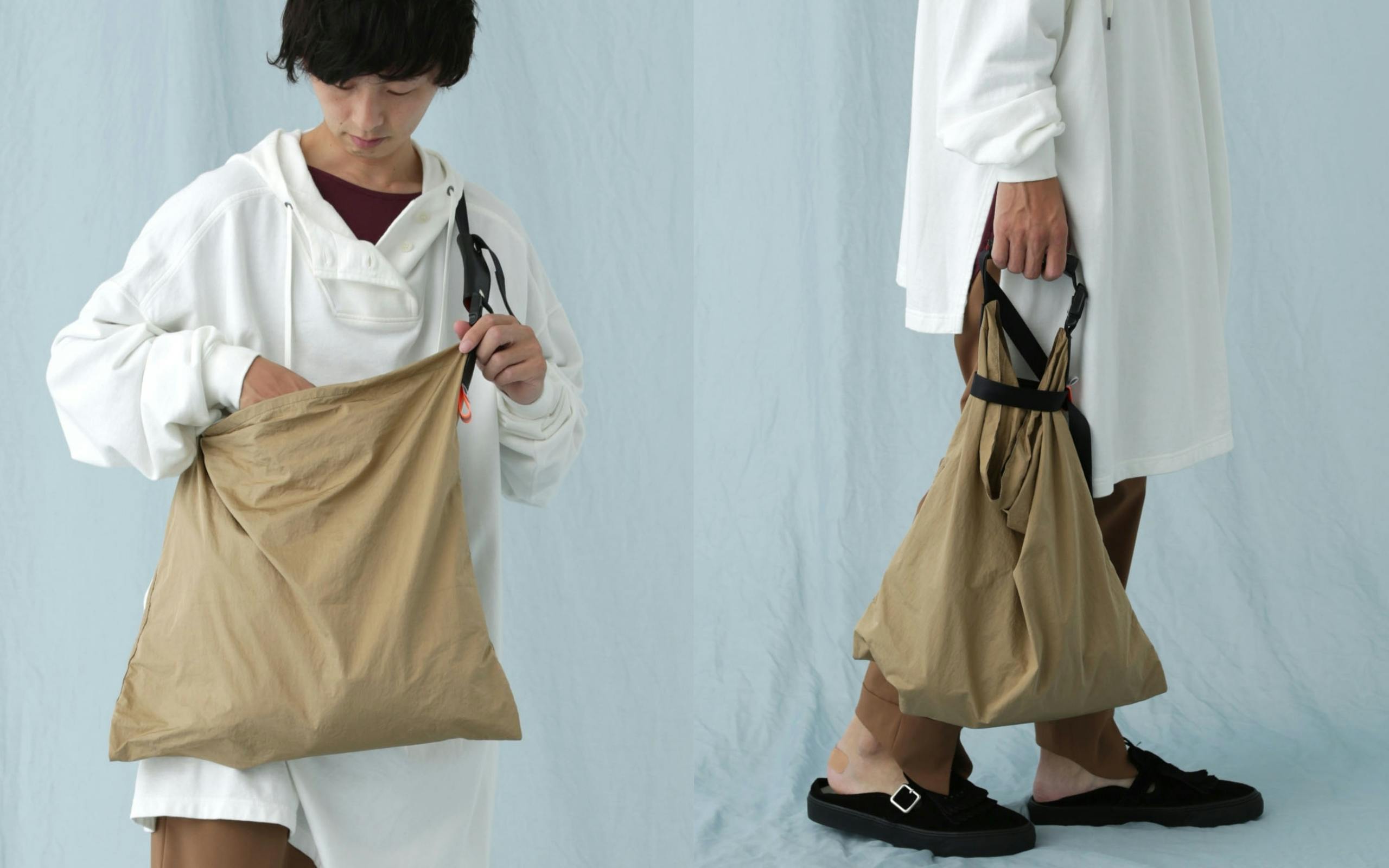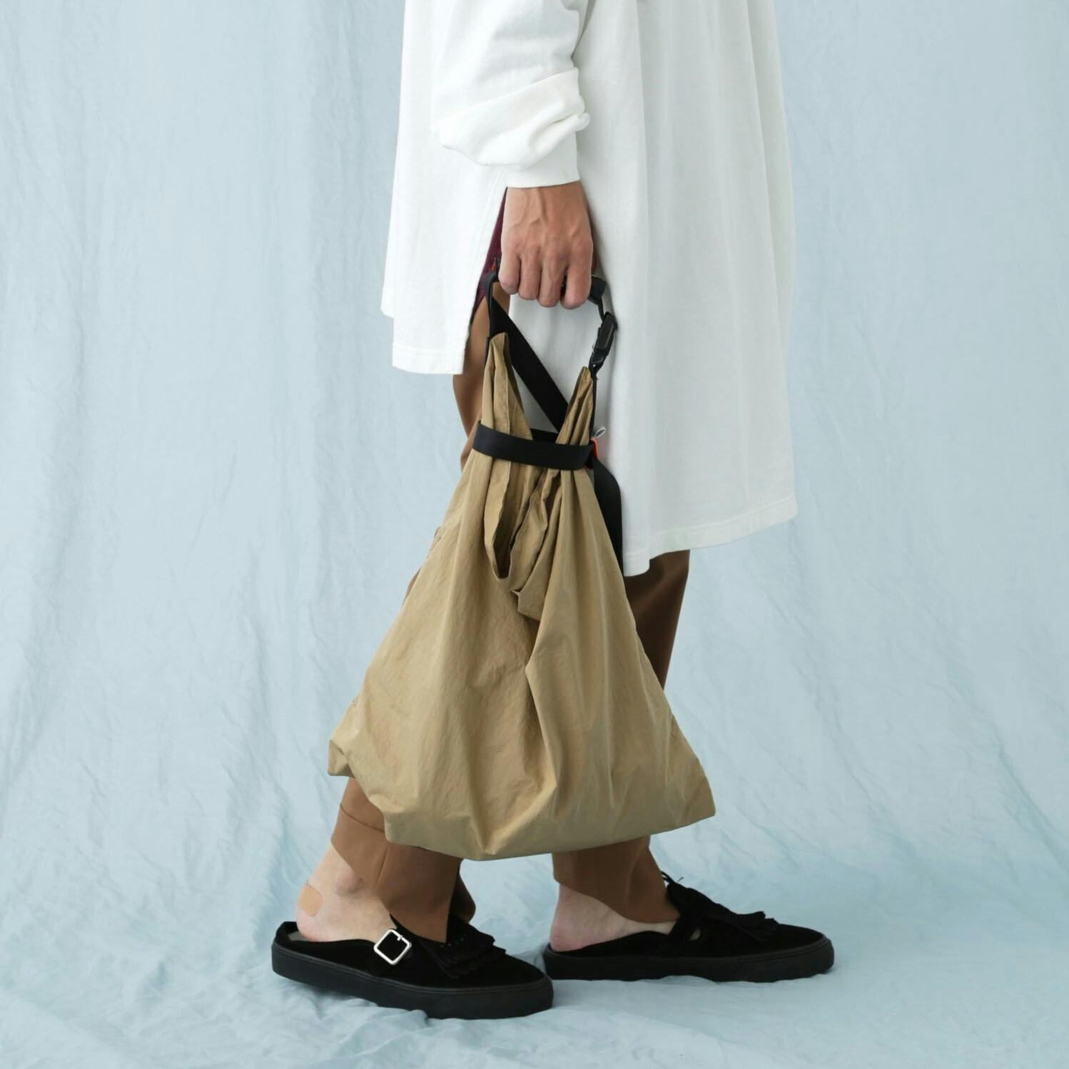 手さげ状態からベルトの長さを調節するだけで肩掛けのトートバックのように即座に変えられます。