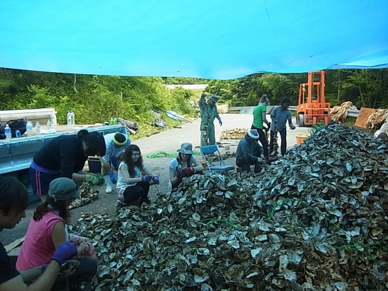 7月8日から13日まで 石巻前網生産組合ではロープをカキ殻に通す作業を行いました。 この作業にもボランティアの皆さんが駆けつけて下さいました。 その中にNPO法人 It's Not Just Mud からも応援して頂きました。海外からのボランティアを受け入れているボランティア団体です。 イギリスやアメリカから支援に来ていただいています。 前網生産組合では、定置網と並行してホヤの養殖も行います。 今回の作業は牡蠣殻に電気ドリルで開けた穴にロープを通す作業です。 これを12月下旬にホヤ筏から海中に吊るすことになります。この牡蠣殻にホヤの幼生(種)が付着するのです。 それから3年後に収穫となります。