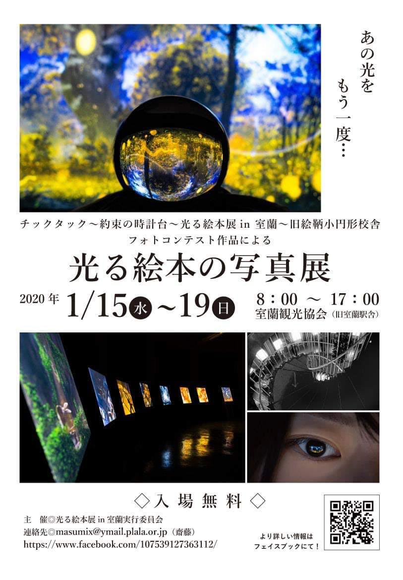 2020/01/15 11:01皆さん、こんにちは。光る絵本展in室蘭実行委員橋本です。本日より室蘭観光協会にて、光る絵本展in室蘭フォトコンテストへご応募いただいた作品たちの写真展が開かれます!と き 2020年1月15日(水)〜19日(日)場 所 室蘭観光協会(室蘭市海岸町)時間 8:00〜17:00入 場 無料入賞、入選に関わらず、提出していただいた全ての作品(38点)の写真展です。「光る絵本展in室蘭」を写した、いくつもの素敵な光景が待っています。各賞受賞作品はもちろんのこと、全ての作品のレベルの高さに実行委員会一同驚いています。ぜひ皆さまお誘い合わせの上ご高覧くださいますよう、お願い申し上げます。 もっと見る
