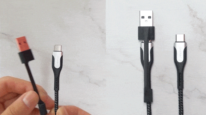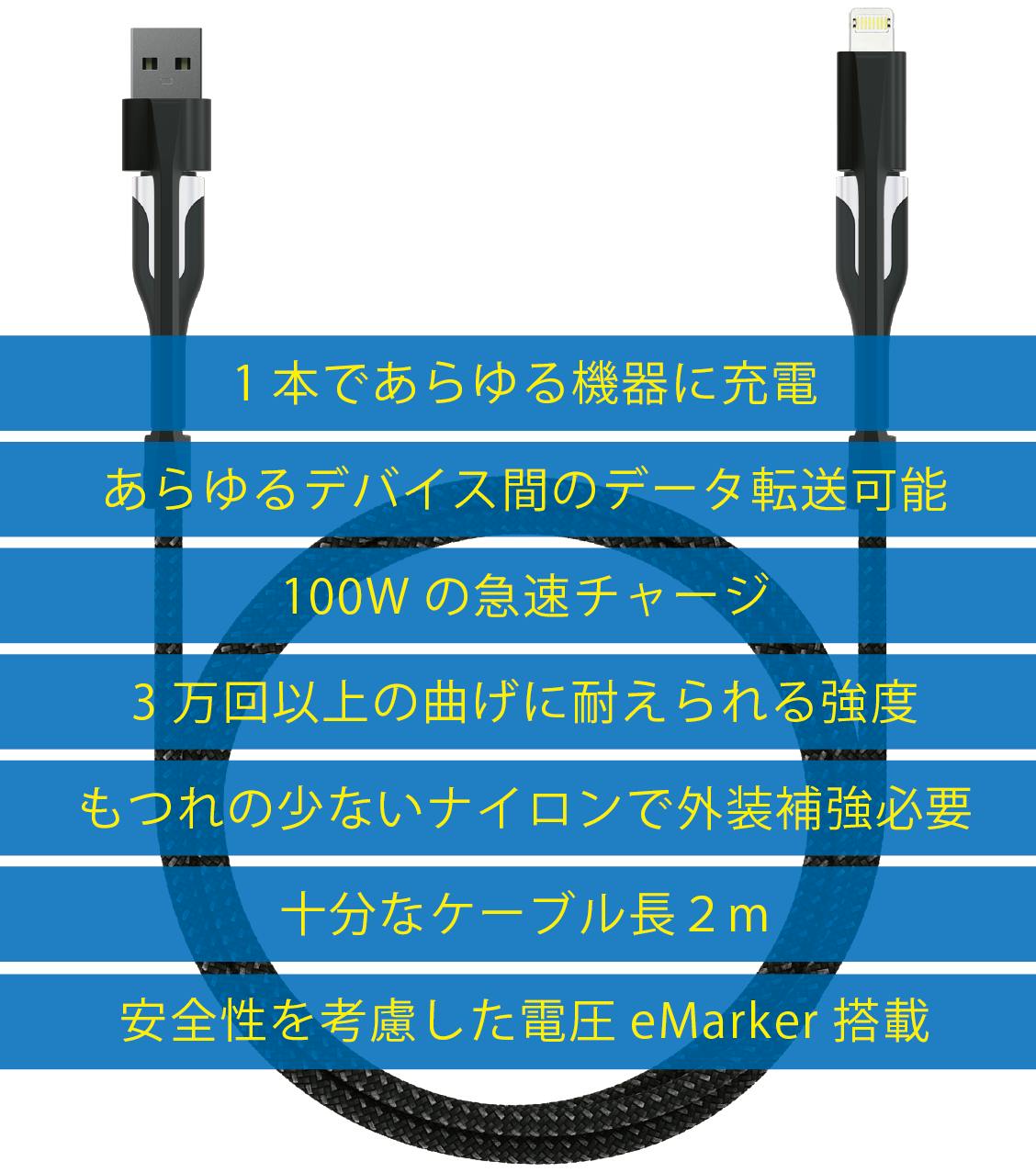 高純度の銅線を利用し、その周りを軍事用に開発された、軽量ながらも通常のナイロンの5倍の強度を持つバリスティックファイバーで保護し、ケーブルの内部の丈夫さを実現。加えて、外観部分も編み込みの独特なデザインで絡まりにくく、外からの圧力にも強い設計になっています。