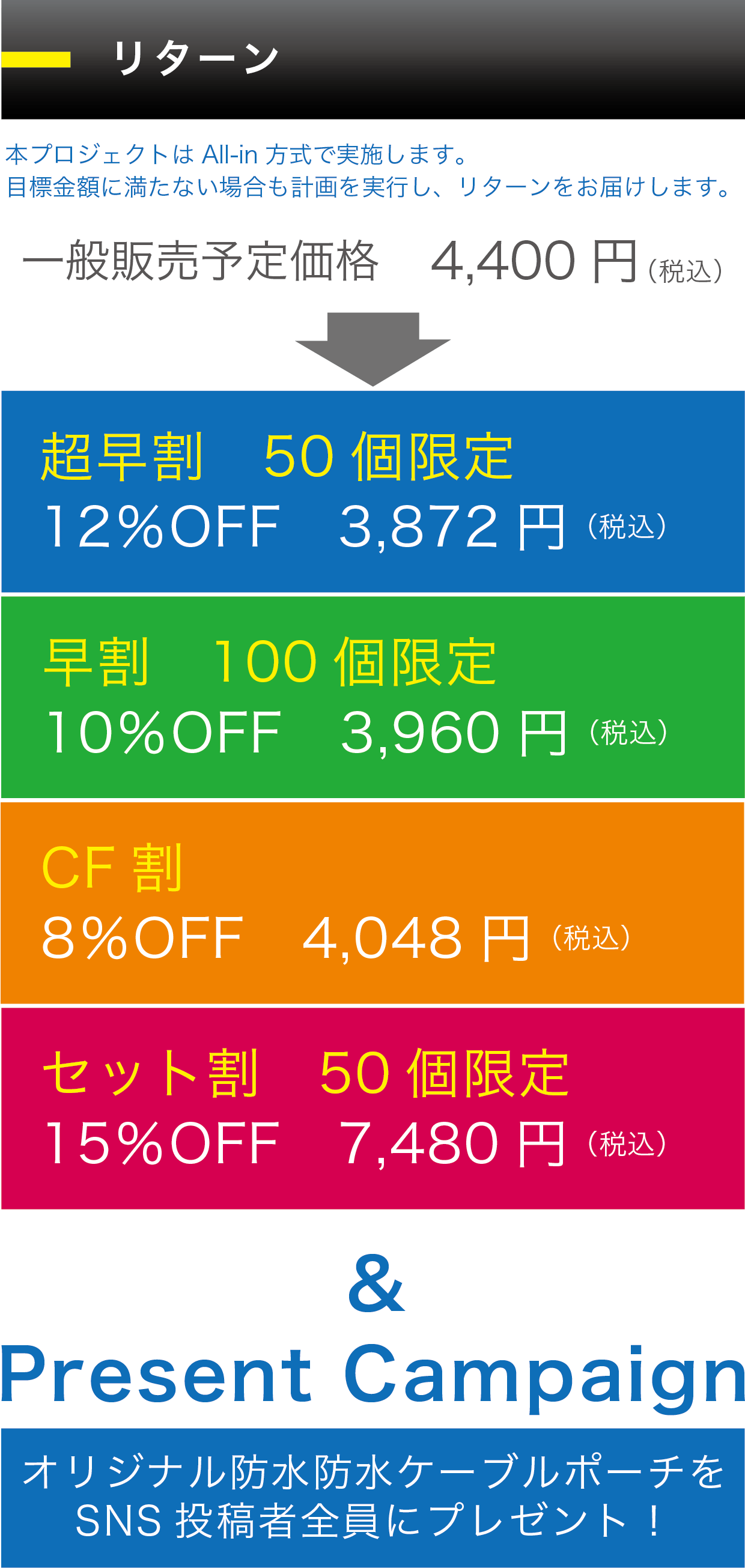 ご支援いただいた後に、Instagram、Twitter、Facebookなどで当プロジェクトページをシェアいただいた方全員に、オリジナル防水ケーブルポーチをプレゼントします。