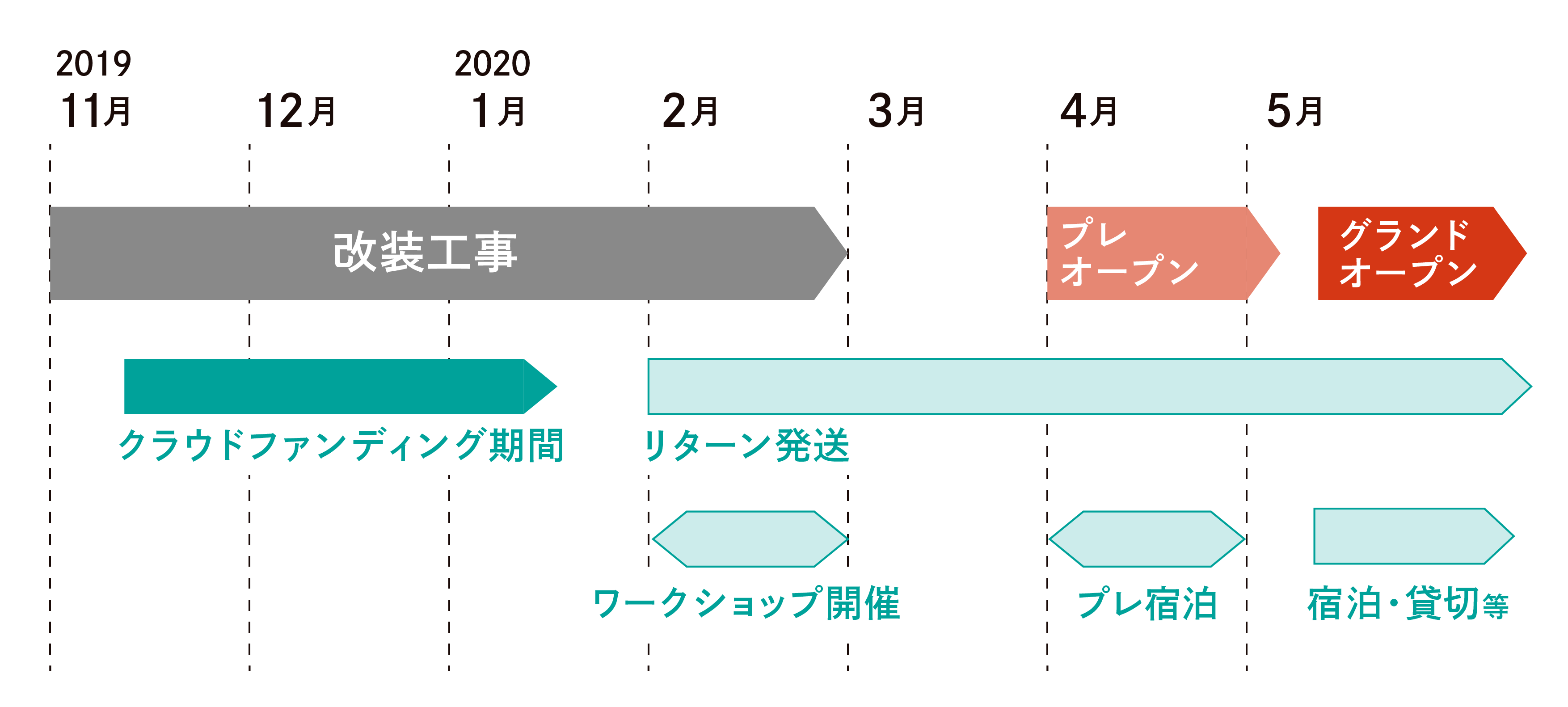 ここで、現在想定している「Guest House & Lounge FARO」開業までのロードマップをお伝えします。5月にはグランドオープンしたいと考えており、現在進んでいる工事も2月いっぱいで終了する予定です。