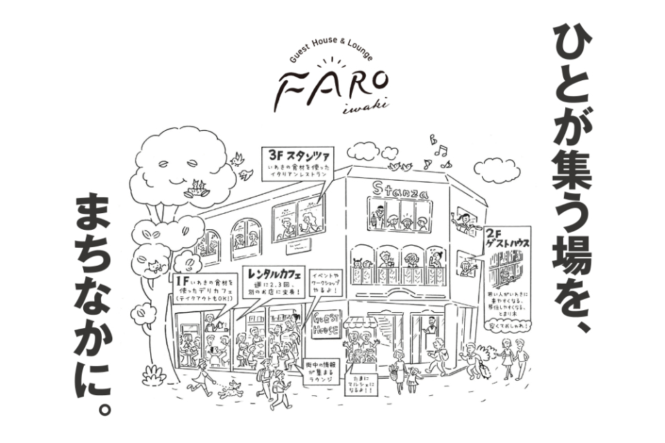 福島県いわき市は、東北最南の先端に位置し、まさに灯台のような場所として旅人が目指す場所でもあります。いわき自体も広く、地域ごとに面白い人や土地、取り組みがあります。そこでゆるやかに旅人とまちの人が交わり、また新たな土地へ向かっていく。ここFAROから、いわきと同じ浜通りや、福島県内各地、さらにその先みちのくへつなぐ拠点にもなればと思っています。