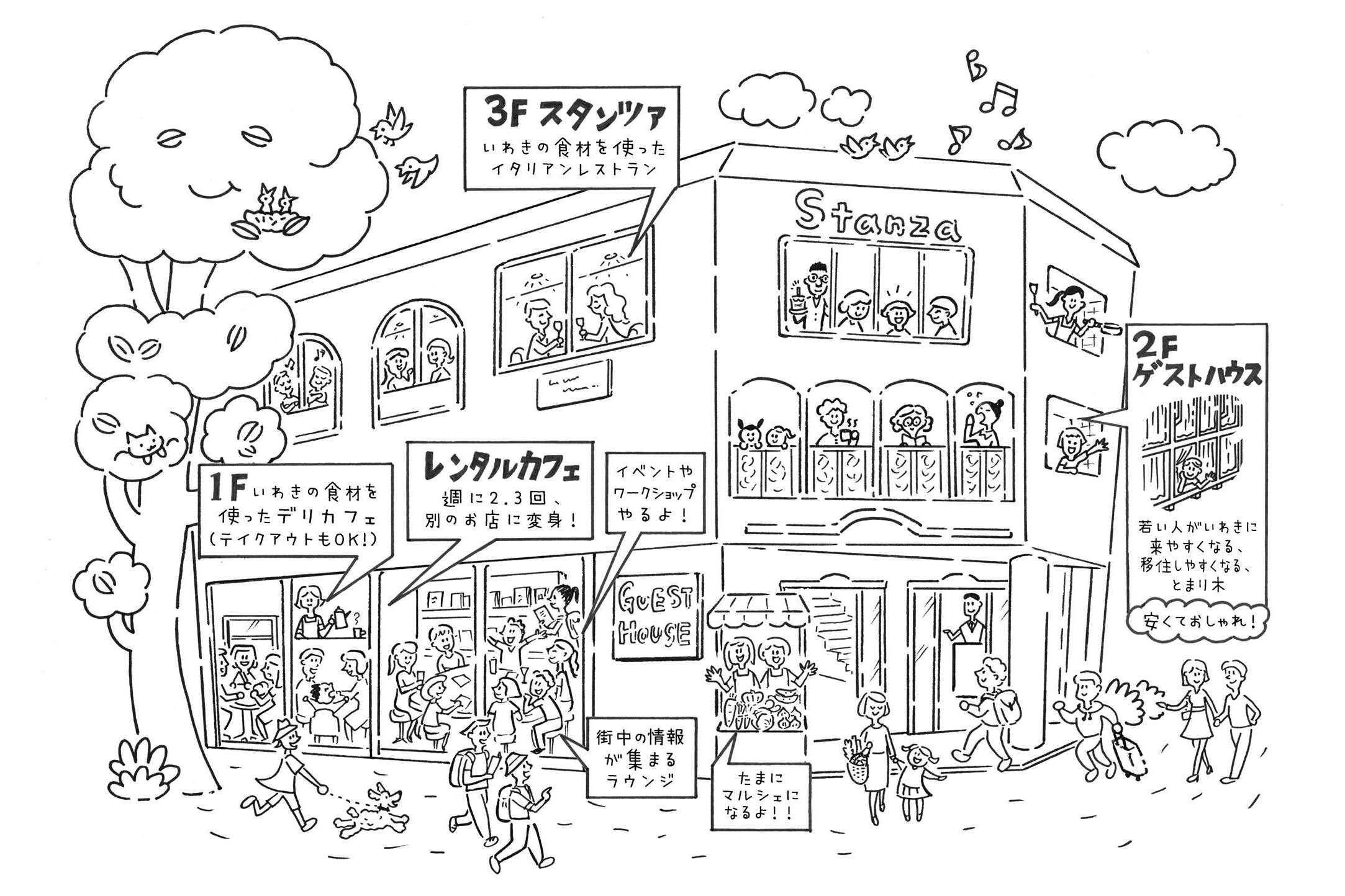 思い起こせば、スタンツァを立ち上げた時から商店街に人が集う場を作りたいという思いは一貫していました。1階と2階で店を経営していた両親の引退を機に、ゲストハウスを立ち上げることを決断。私の中の妄想を、デザイナーの藤城光さんに形にしてもらったのがこの絵です。想いが詰まったこの1枚から、ゲストハウスプロジェクトは始まりました。