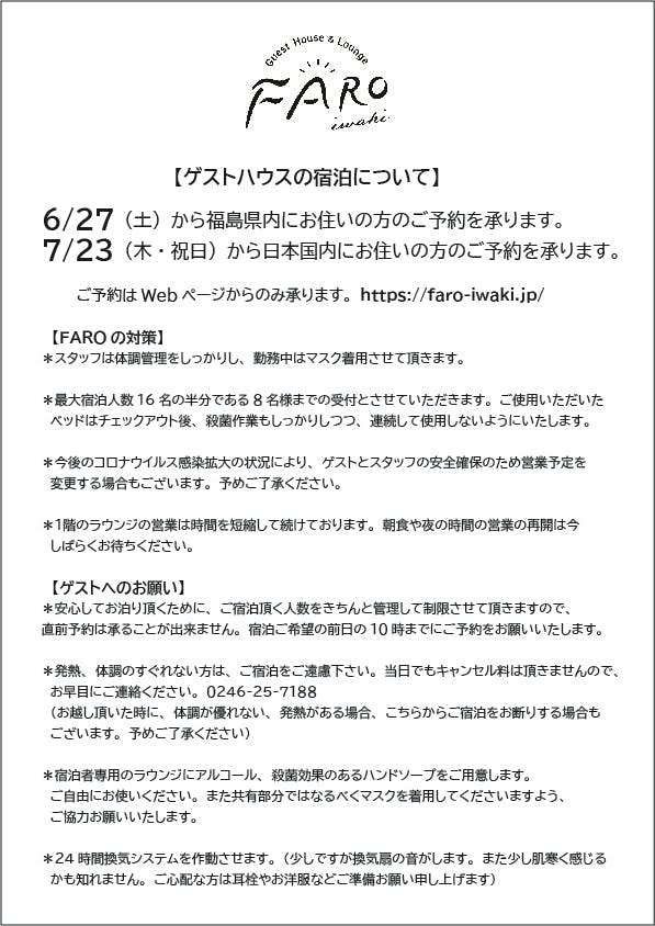 2020/05/29 16:024/24のグランドオープン以来延期しておりました宿泊の受付を段階的に始めさせていただこうと思います。コロナウイルス感染拡大防止のため、ご不便をおかけすることも多々ございますが、それでも皆様と安全にお会いできるよう努めて参りますので、何卒ご理解、ご協力の程宜しくお願い申し上げます。ーーーーーーーーーーーーーーー【ゲストハウスの宿泊について】6/27(土)から福島県内にお住いの方のご予約を承ります。7/23(木・祝日)から日本国内にお住いの方のご予約を承ります。ご予約はWebページからのみ承ります。https://faro-iwaki.jp/ 【FAROの対策】*スタッフは体調管理をしっかりし、勤務中はマスク着用させて頂きます。*最大宿泊人数16名の半分である8名様までの受付とさせていただきます。ご使用いただいたベッドはチェックアウト後、殺菌作業もしっかりしつつ、連続して使用しないようにいたします。*今後のコロナウイルス感染拡大の状況により、ゲストとスタッフの安全確保のため営業予定を変更する場合もございます。予めご了承ください。*1階のラウンジの営業は時間を短縮して続けております。朝食や夜の時間の営業の再開は今しばらくお待ちください。 【ゲストの皆様へのお願い】*安心してお泊り頂くために、ご宿泊頂く人数をきちんと管理して制限させて頂きますので、直前予約は承ることが出来ません。宿泊ご希望の前日の10時までにご予約をお願いいたします。*発熱、体調のすぐれない方は、ご宿泊をご遠慮下さい。当日でもキャンセル料は頂きませんので、お早目にご連絡ください。0246-25-7188(お越し頂いた時に、体調が優れない、発熱がある場合、こちらからご宿泊をお断りする場合もございます。予めご了承ください)*宿泊者専用のラウンジにアルコール、殺菌効果のあるハンドソープをご用意します。ご自由にお使いください。また共有部分ではなるべくマスクを着用してくださいますよう、ご協力お願いいたします。*24時間換気システムを作動させます。(少しですが換気扇の音がします。また少し肌寒く感じるかも知れません。ご心配な方は耳栓やお洋服などご準備お願い申し上げます) もっと見る