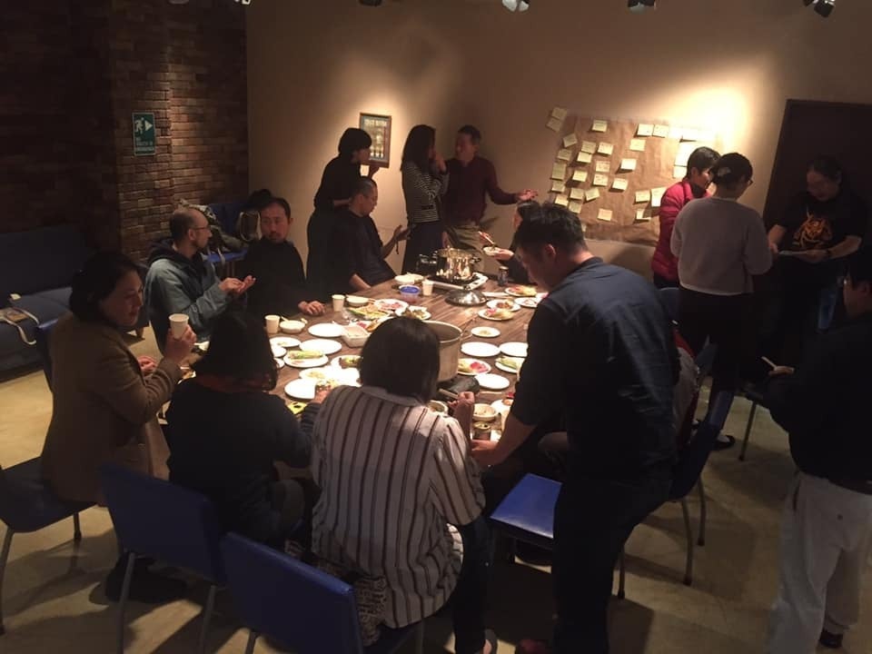 18時からゆるりとスタートしまして、お酒に鍋をつつきながら、みんなでマニアックないわきネタや質問事項を好き勝手に付箋に書いて壁に貼っていきます。