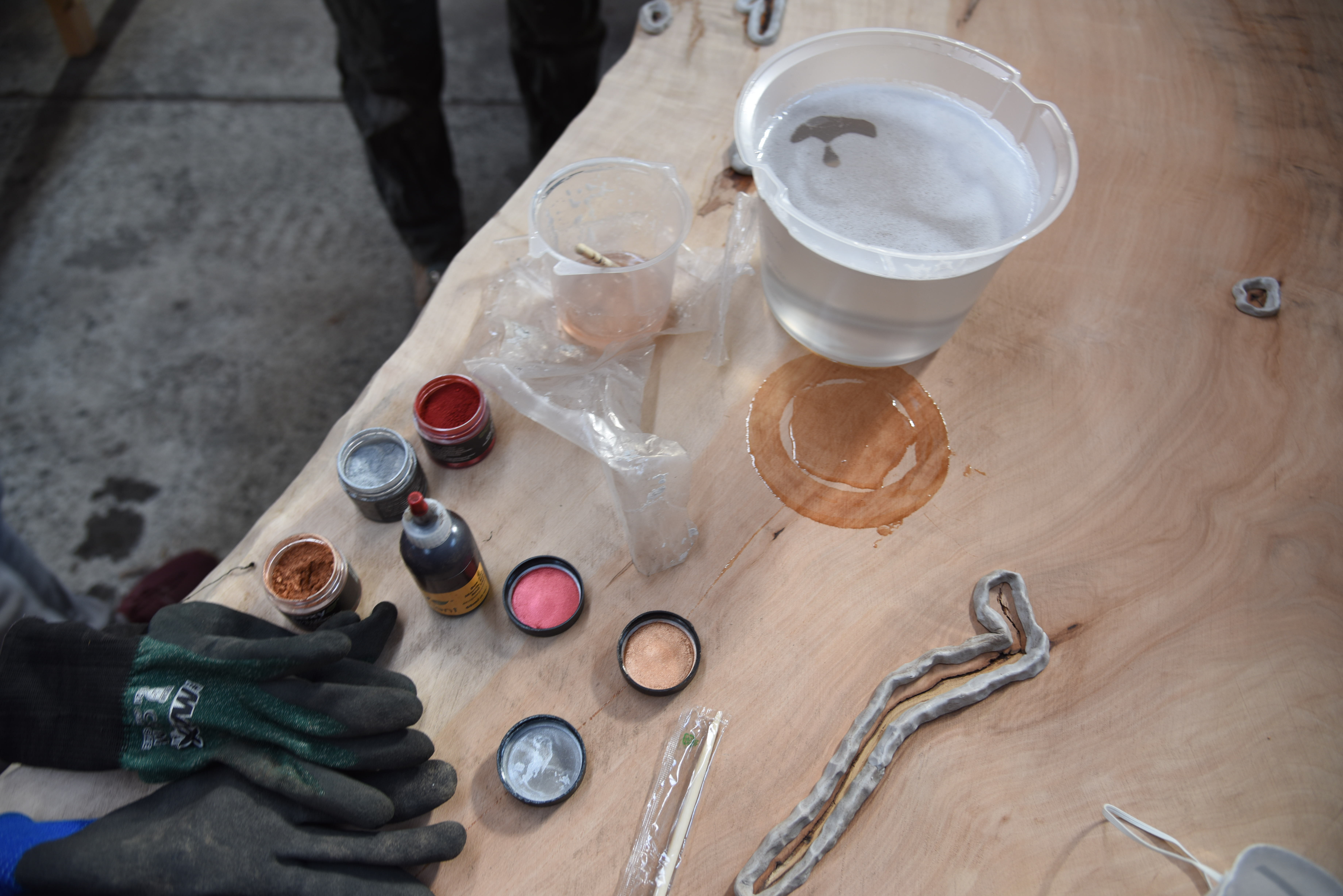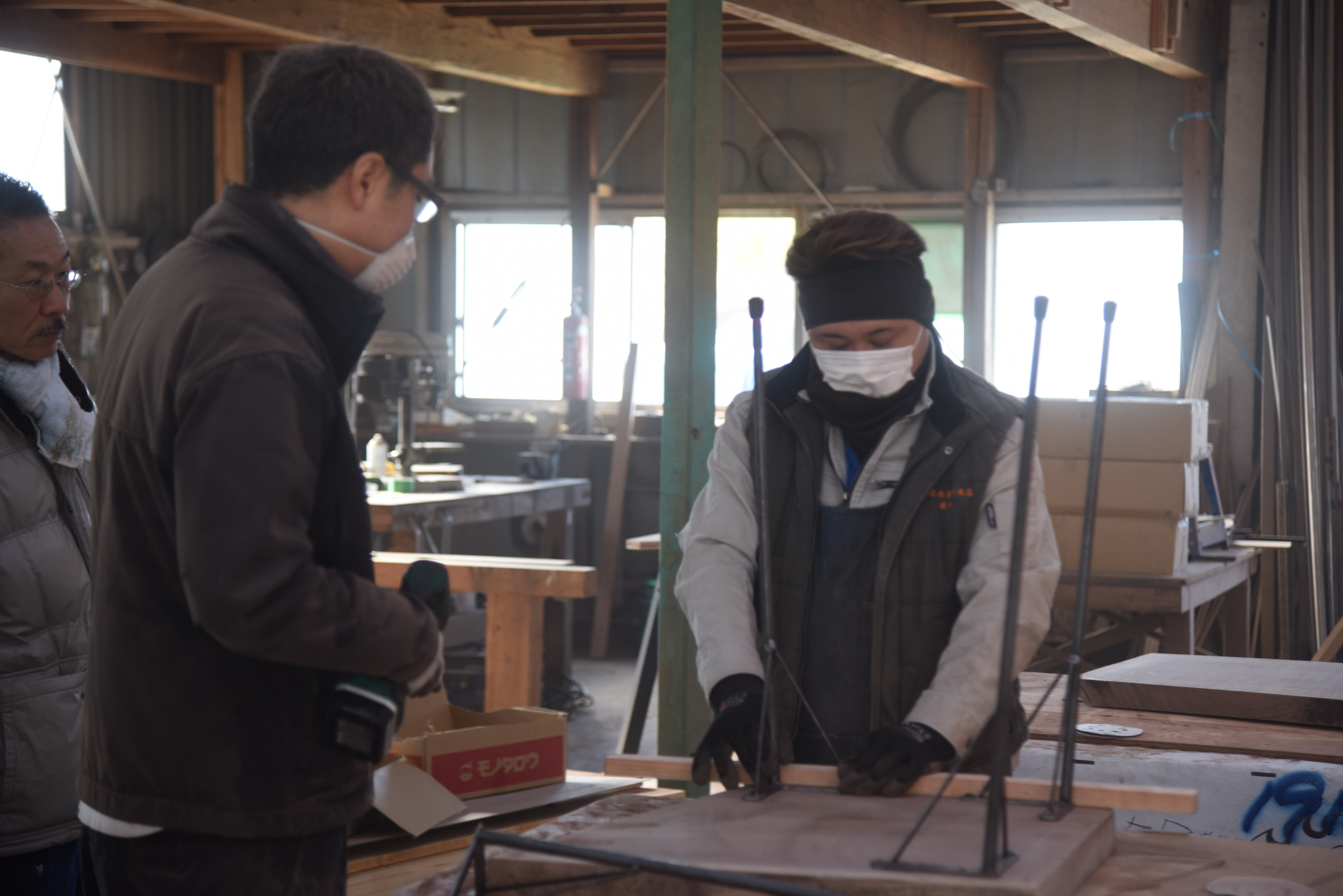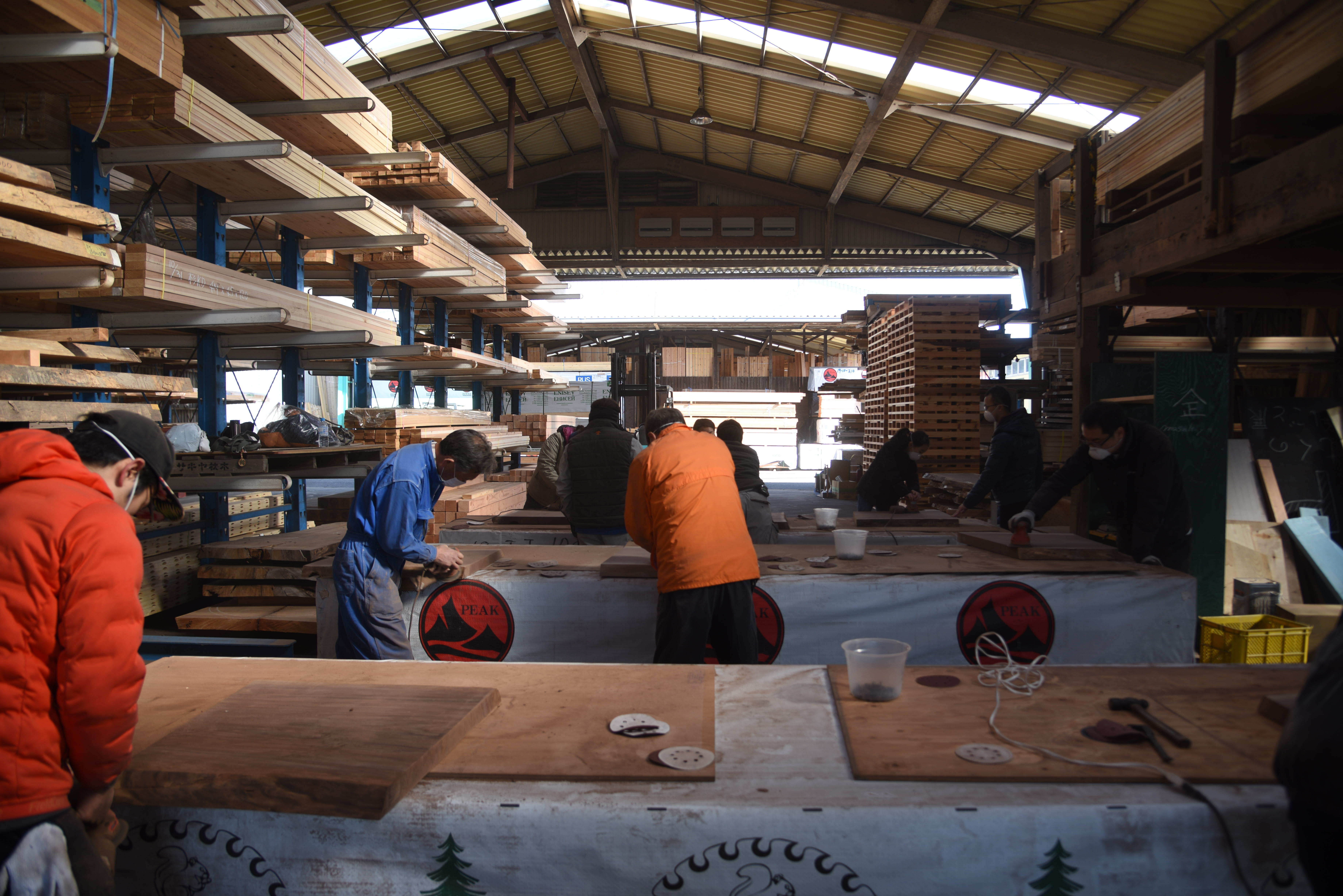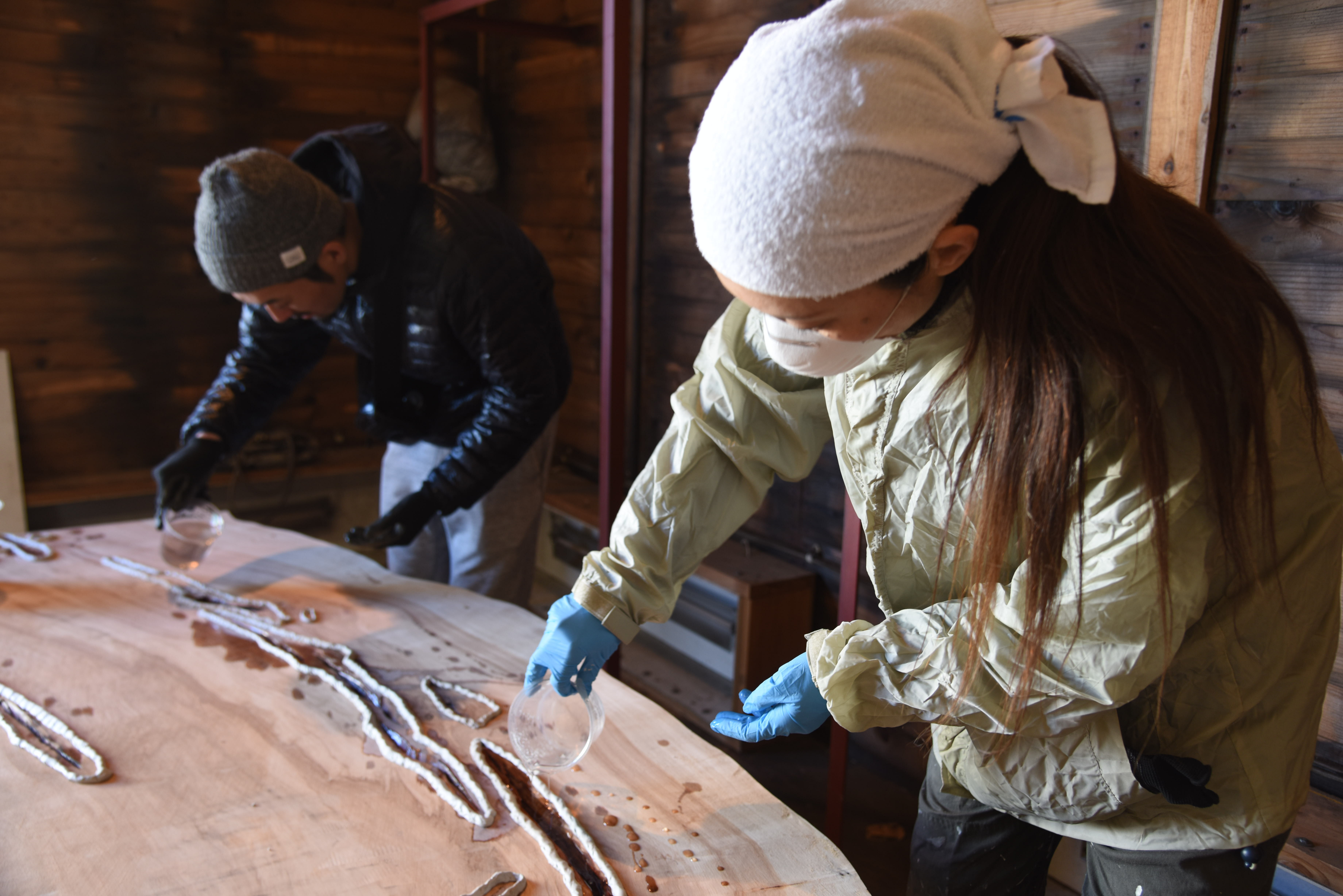 さて、今回とてもたくさんの方にご参加頂きましたので、私たちは別の建物でFAROのシンボルとなる「栃のテーブル」のレジン加工をやらせていただきました。
